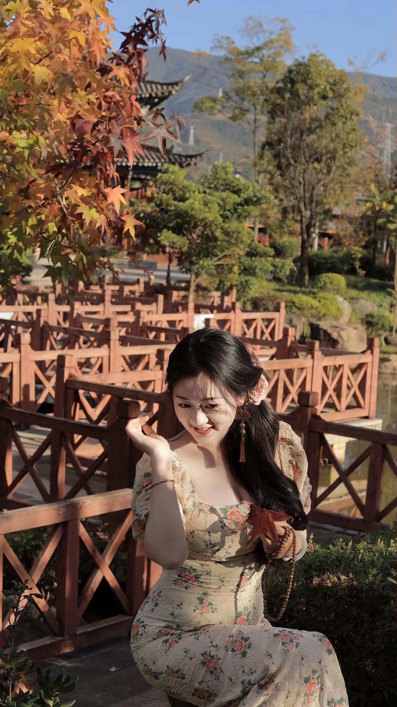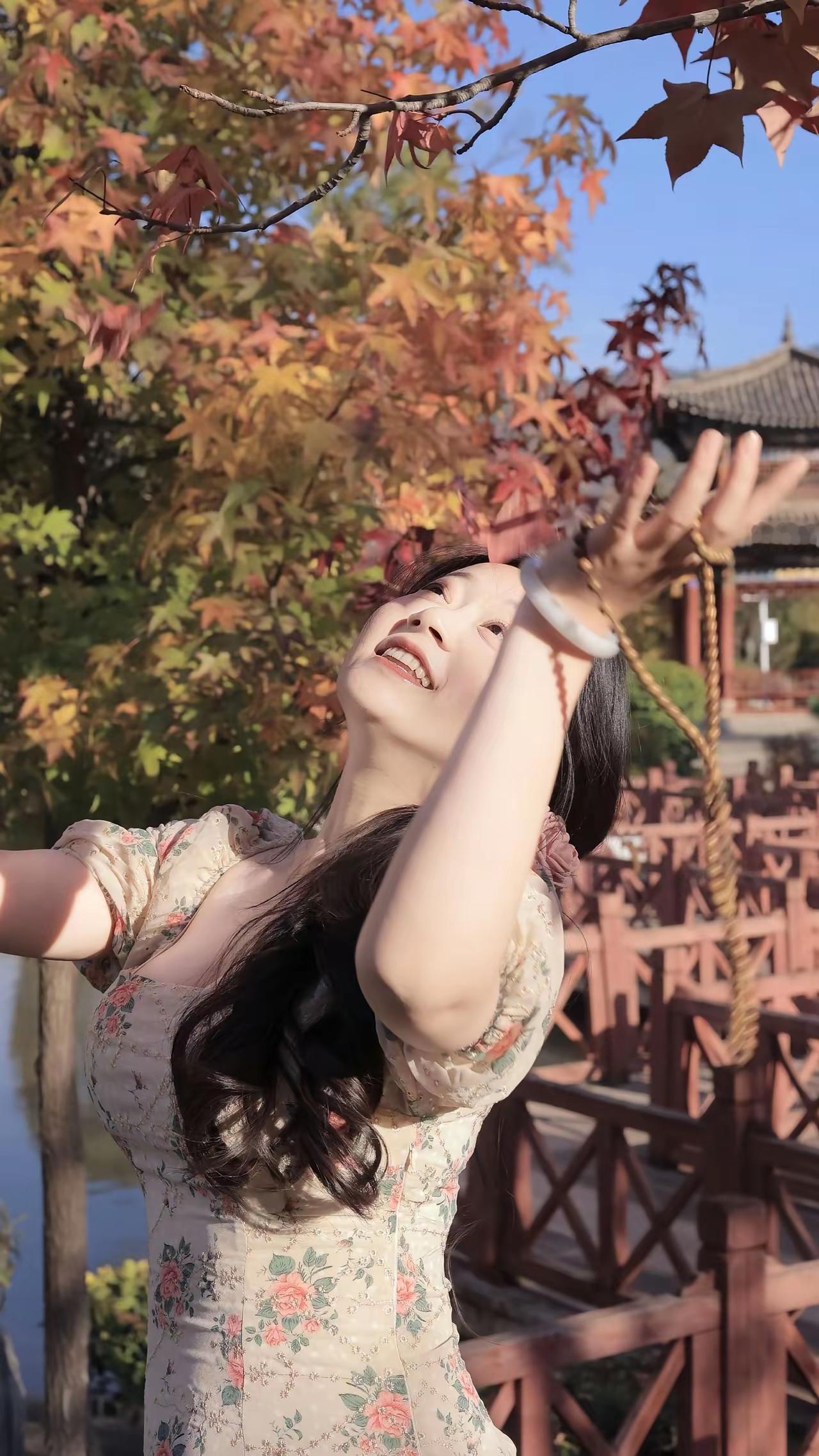 秋日暖阳下,少女与枫叶共舞,笑靥如花。