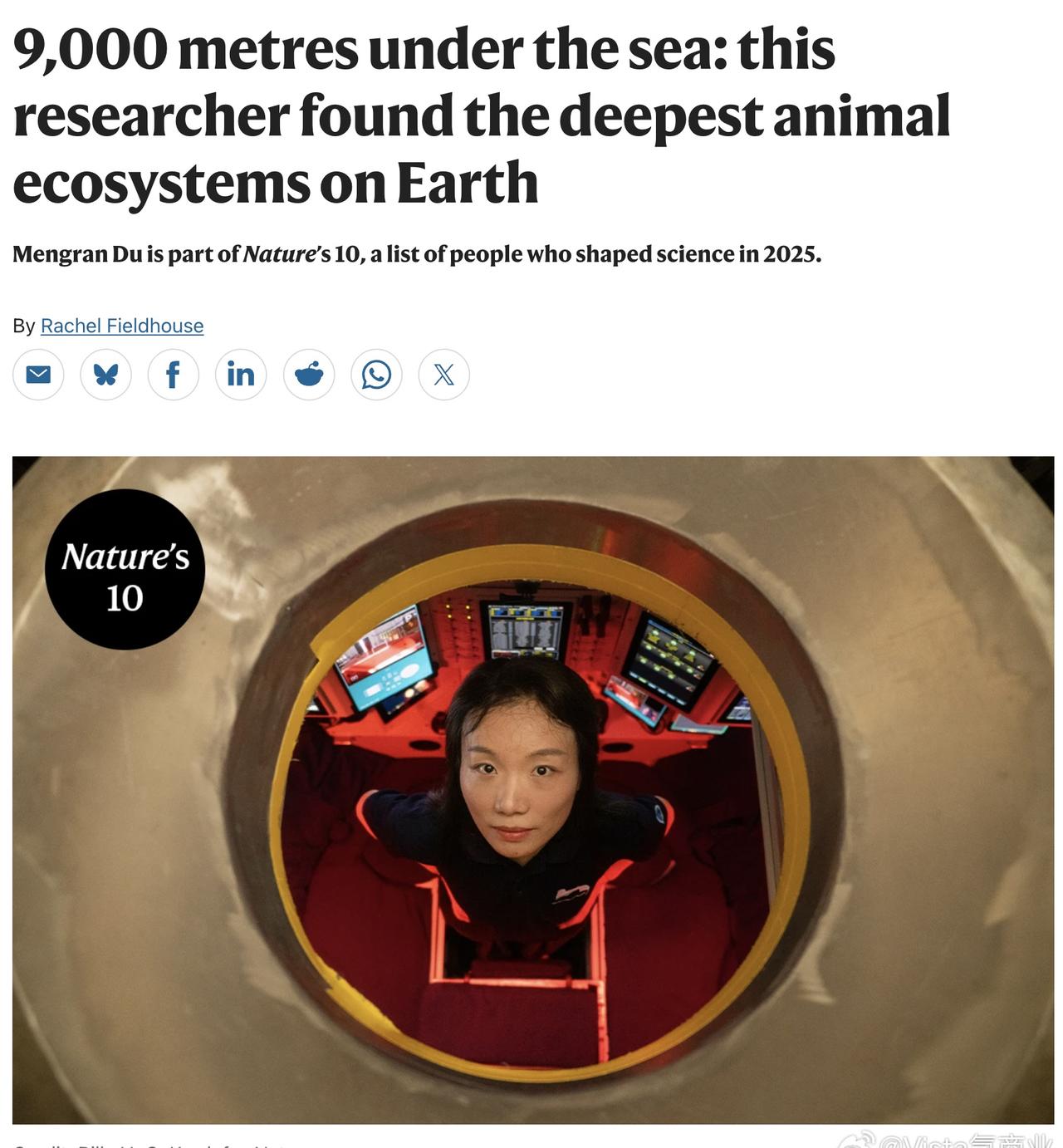 12月9日凌晨,国际知名学术期刊《自然》在线公布了其2025年度十大人物榜单(Nature’s10),中国科学院深海科学与工程研究所地质学家杜梦然、中国DeepSeek创始人梁文锋两位中国学者入选。 《自然》杂志对杜梦然的评价为“揭开地球最深处动物生态系统的科学家”。据介绍,杜梦然及其团队于2024年乘坐潜水器潜入海面下9000多米,发现了地球上已知最深的、拥有动物的生态系统,并于今年发表了相关研究成果。 《自然》杂志评价梁文锋为“科技颠覆者”,称“这位中国金融奇才凭借其DeepSeek人工智能模型震惊了世界”。 除杜梦然以外,十大人物中还有4位女性入选,分别是美国微生物学家和免疫学家Susan Monarez 、南非金山大学公共卫生官员Precious Matsoso、英国伦敦大学学院神经学家Sarah Tabrizi、以色列魏茨曼科学研究所的系统生物学家Yifat Merbl。 名单中还包括一名婴儿KJ Muldoon。他出生后即被确诊罕见的遗传疾病“CPS1缺乏症”,成为接受个性化CRISPR基因编辑疗法的首例患者。这项治疗成功挽救了他的生命。 施普林格·自然媒体办公室称,《自然》年度十大人物并非一个奖项,也不是全球前十排行榜,它是对当年重要科学进展、事件以及其中一些关键人物和他们同事的记录。十大人物由《自然》编辑选出,集中反映出影响2025年一些最重要科学事件的个人。(@Vista氢商业 综合Nature、中新网)