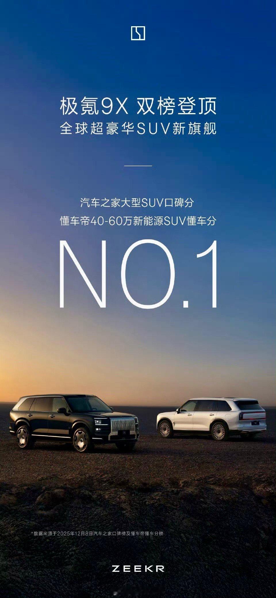 极氪9X 实力出圈,口碑双冠王! 荣登「汽车之家」大型SUV口碑榜榜首, 同时斩获「懂车帝」40-60万新能源SUV懂车分第一。