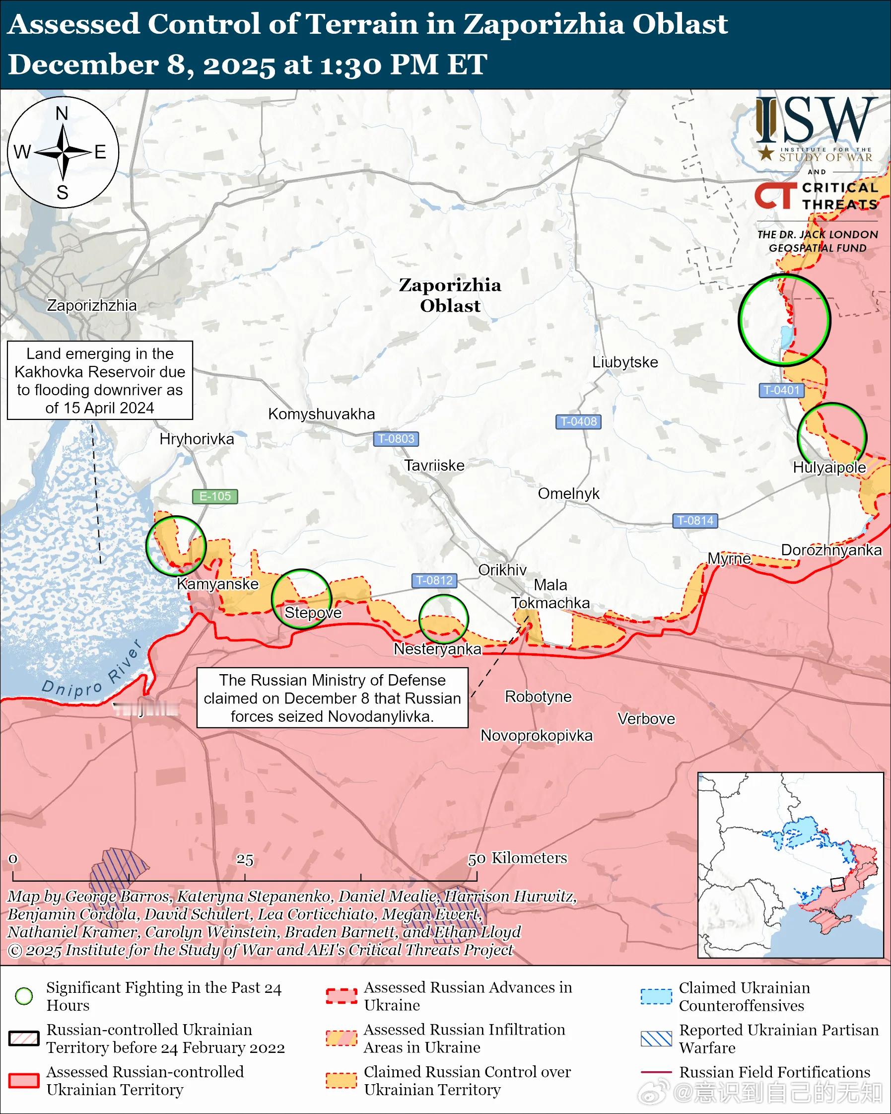 南方轴心俄军目标:守住前线阵地,确保后方免受乌克兰军队袭击,并推进至扎波罗热市的火炮射程之内。12月8日俄军继续向胡利亚波列方向发起进攻,但并未取得确切进展。未经证实的说法:俄罗斯军事博客作者声称,俄军向胡利亚伊波列北部和东部郊区推进。12月7日和8日,俄军在胡利亚伊波列附近、胡利亚伊波列以北的拉迪斯内附近以及多布罗皮利亚、普里卢基、泽列内和瓦尔瓦里夫卡方向发动进攻;并在胡利亚伊波列东北部的索洛德克、普里维尔内、兹拉霍达和雷布内附近发动进攻。一位俄罗斯军事博主声称,乌克兰军队在多布罗皮利亚附近进行了反击。作战序列:据报道俄第57和第60摩步旅(均隶属于东部军区第5集团军)的(FPV)无人机操作员正在胡利亚伊波列附近袭击乌克兰部队和车辆。第305炮兵旅(隶属于第5集团军)的多管火箭炮(MLRS)部队正在胡利亚伊波列附近向乌克兰部队发射传单。第14特种部队旅(隶属于俄罗斯总参谋部情报总局[GRU])的无人机操作员正在胡利亚伊波列区上空拦截乌克兰无人机。12月8日俄军继续在扎波罗热州西部发动进攻,但并未取得确切进展。未经证实的说法:俄罗斯国防部声称俄军占领了新达尼利夫卡(奥里希夫东南部)。一位俄罗斯军事博主声称俄军推进至卢基亚尼夫克塞以南、斯捷普诺戈尔斯克以东(奥里希夫以西)。12月7日和8日,俄军在奥里希夫东南方向的新达尼利夫卡附近、奥里希夫西南方向的新安德里夫卡附近以及奥里希夫西方向的斯捷普诺戈尔斯克、普里莫尔斯克和斯捷波韦附近发动进攻。乌克兰国家警察和扎波罗热州军事管理局局长伊万·费多罗夫于 12 月 8 日报告称,俄军对扎波罗热市工业区和维尔尼扬斯克(扎波罗热市东北部)进行了三次制导滑翔炸弹袭击,造成 15 人受伤。作战序列:据报道俄第四军事基地(南部军区第58民防航空队)的FPV无人机操作员正在奥里希夫方向打击乌克兰阵地。第11独立空降旅正在使用配备爆炸装置的无人地面车辆(UGV)打击奥里希夫附近的乌克兰阵地。第108空降团(第7空降师)继续在扎波罗热方向作战。12月8日俄军继续向赫尔松方向发起有限的地面进攻,但没有取得进展。12月7日和8日,俄军在赫尔松市以东的安东尼夫斯基桥附近发动进攻。战斗序列:据报道俄军第98空降师第217空降团和第215独立侦察营正在赫尔松方向打击乌克兰的装备和阵地,包括赫尔松市。