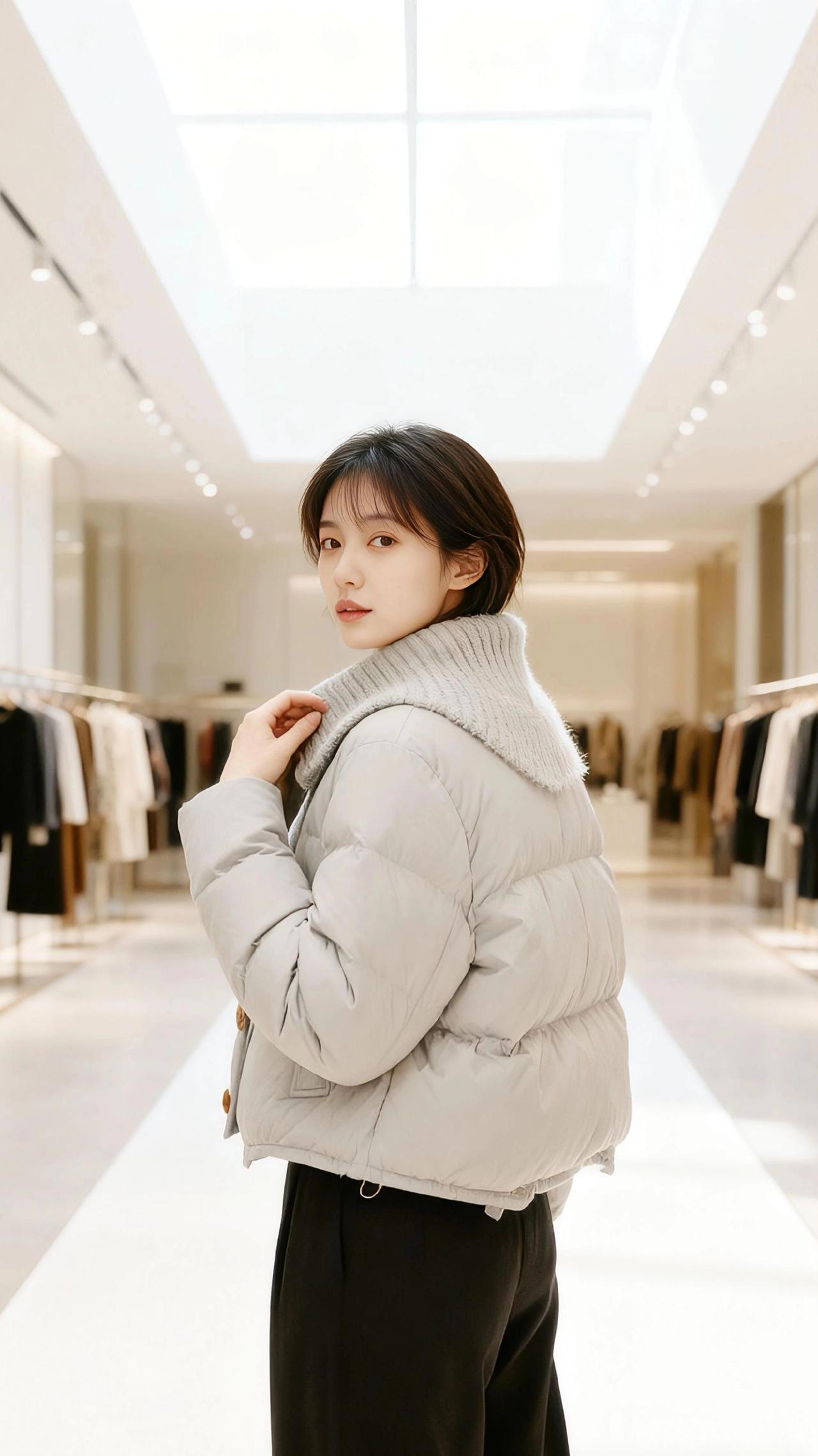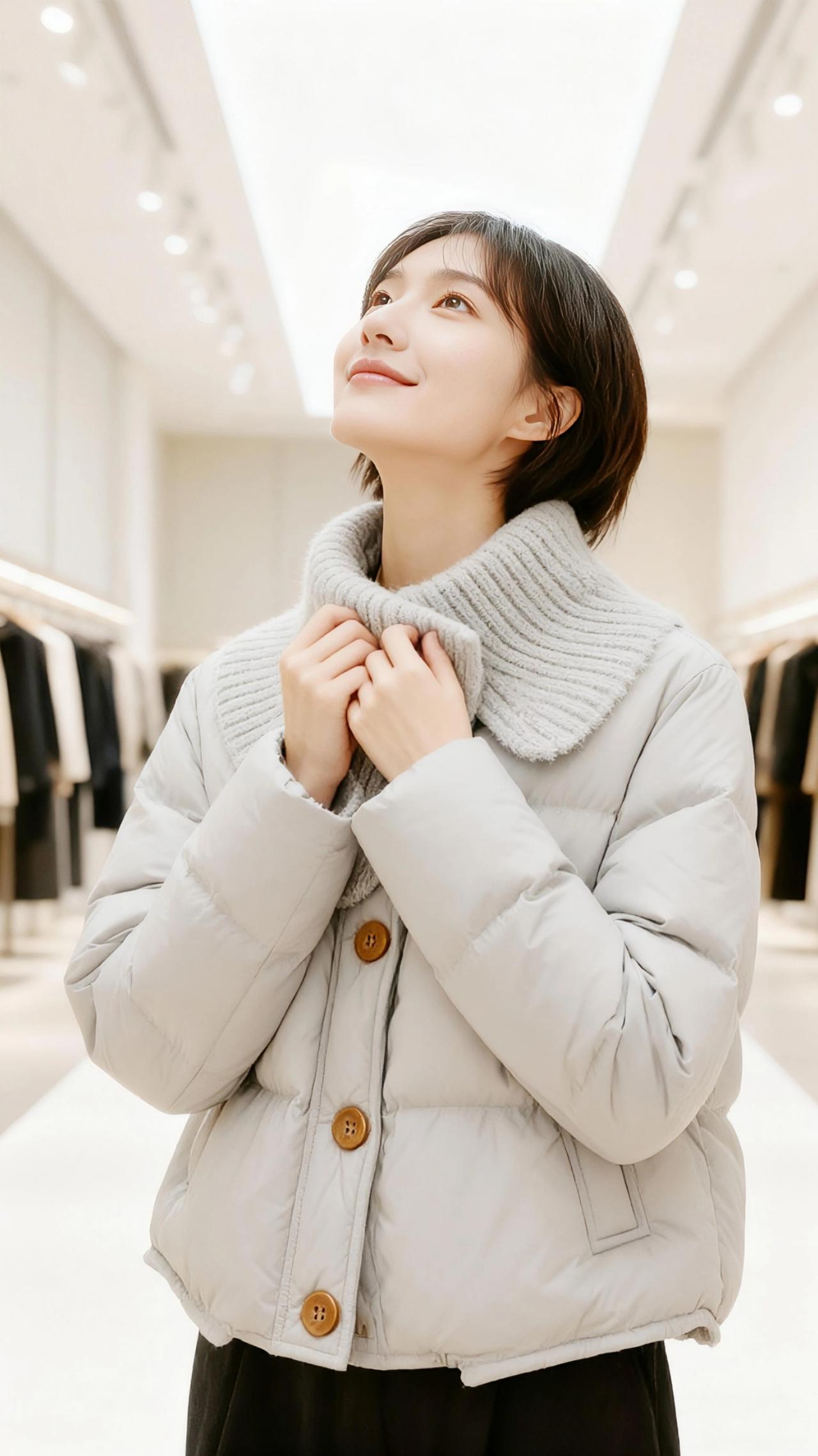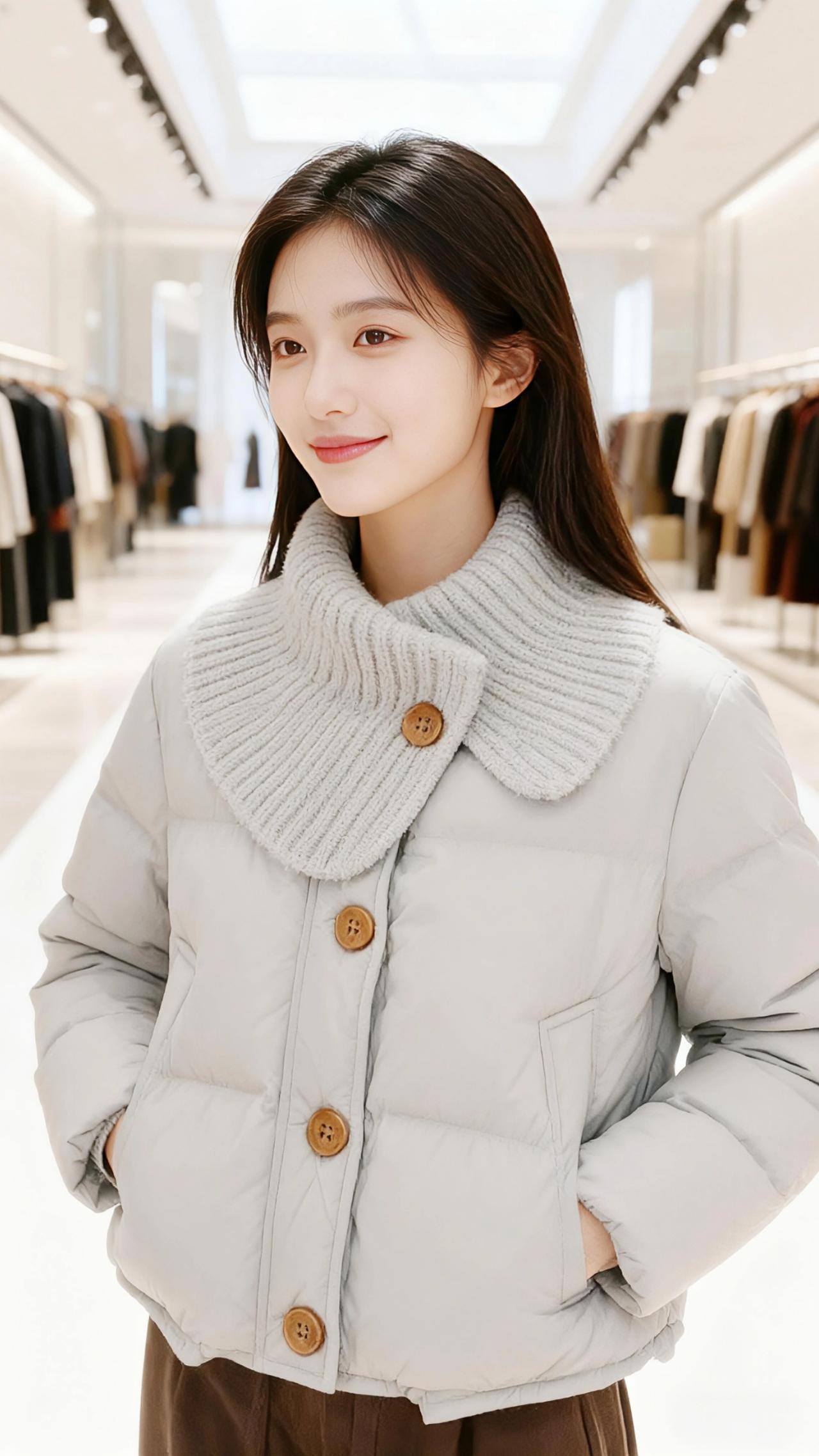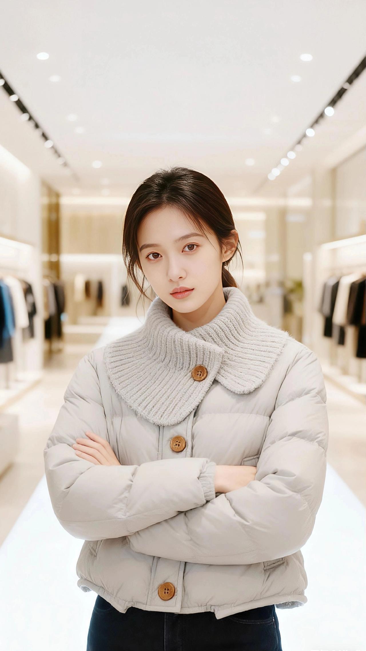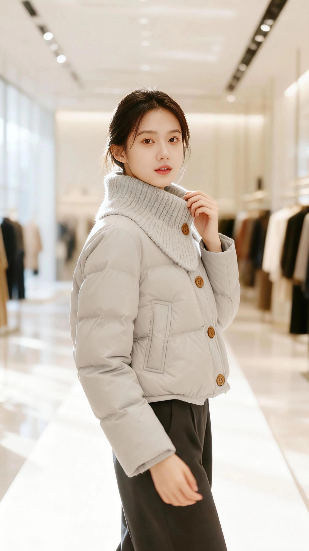 浅灰的暖,是冬日里裹在身上的云。 她立在光洁的衣行间,领口那圈软绒像偷来的月光,织着蓬松的纹路,被指尖轻轻拢住时,连风都慢了半拍。木质纽扣嵌在蓬松的衣料上,像把秋天的温软,钉进了冬的蓬松里。 发梢垂落或挽起,都是这抹淡色里的涟漪——有时是笑意在领口漫开,有时是侧颈的弧度碰着绒边,连转身时衣摆的轻晃,都裹着温吞的软。 这哪里是一件衣,分明是把日子揉成了软和的模样,连冷都成了轻拍在肩上的,温柔的风。 高级感穿搭 外套穿搭 冬季穿搭 棉服也能穿出时尚感
