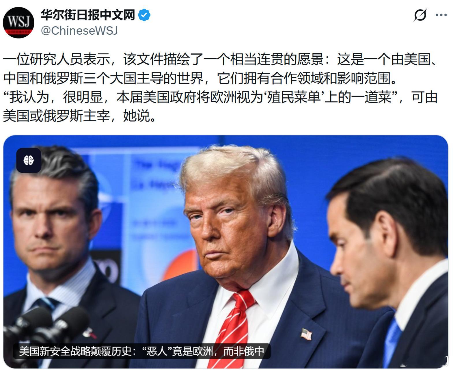 《华尔街日报》:新出台的《美国国家安全战略》描绘了一个相当连贯的愿景,这是一个由美国、中国和俄罗斯三个大国主导的世界,它们拥有合作领域和影响范围而欧洲视为‘殖民菜单’上的一道菜”,可由美国或俄罗斯主宰。没办法,中国给了欧洲足够的尊重和耐心,认为欧洲可以成为世界的一极,奈何欧洲只想做美国的狗。可惜在美国眼里,狗可以当宠物,也可以变成狗肉。既然欧洲自己不想坐上桌,那么只能被端上桌-当菜。