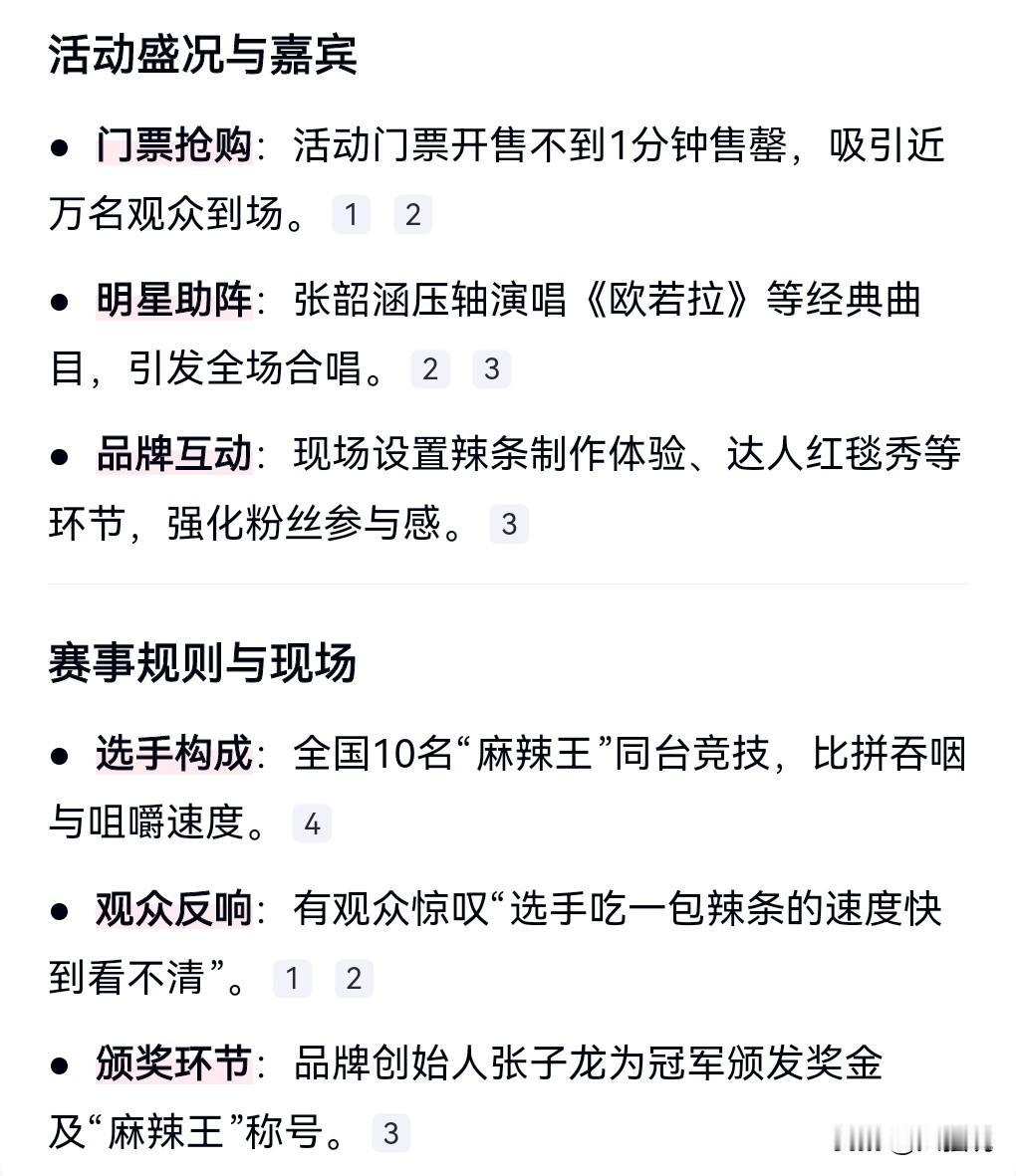 这钱也太好挣了吧。 小伙2分钟吃73根辣条赢7300元。 不过吃这么多辣条可别进医院啊,毕竟辣条也不是什么好东西。 吃太多辣,我的身体可是受不了。 麻辣王子频繁上热搜也是厉害了啊。 竟然还请了张韶涵压轴唱歌,这企业挺有实力的。 竟然还搞了一个麻辣王子粉丝见面会,竟然还一票难求,真的是让我震惊了。