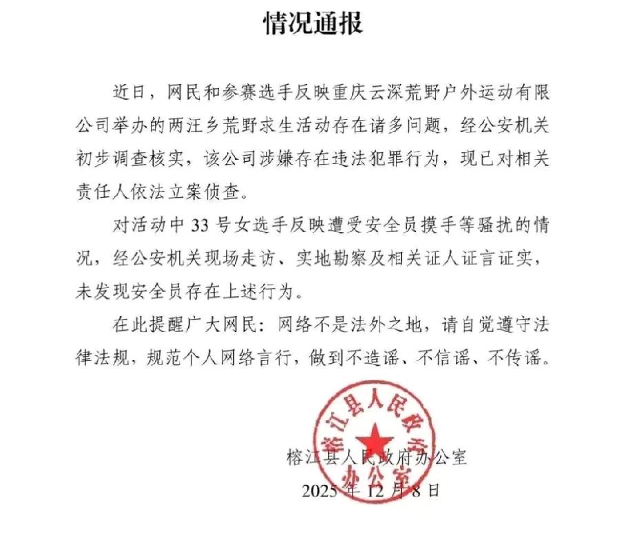 荒野求生赛停赛 辛苦了参赛队员,出力没个结果。最近,贵州榕江县“荒野求生赛”现已停赛,这么一个影响较大的赛事说停就停了,关注度也很大。其间还传闻33号女选手反映遭受安全员摸手等骚扰。现在榕江县人民政府于12月8日发出了情况通报。停赛系主办公司涉嫌违法犯罪。对于33号选手反映之事做出了明确否定。这么大赛事肯定要先报批,不知哪些方面出了问题。