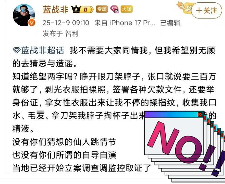 刷到蓝战非这事儿! 看完真的浑身起鸡皮疙瘩! 绑架索要300万赎金就算了, 这帮人竟然疯狂收集他的DNA——口水、毛发,还有隐私体液,甚至逼他穿女装按指纹,这操作实在让人胆寒。 一开始以为就是普通的绑架求财,可越看越觉得不对劲。300万赎金在这类事件里不算离谱,但索要DNA和指纹的操作,根本不是单纯求财的路数。这哪里是想要钱,分明是想“复制”一个人,或者埋下一套完整的栽赃证据链,细想一下简直毛骨悚然。 最让人不安的是逼他穿女装拍照的环节。别以为只是单纯的羞辱,这明显是在做局。手里握着他的DNA样本,再加上这些特殊照片,将来随便在哪个案发现场丢一根头发、一点体液,再把照片散布出去,就算他有一百张嘴,也说不清道不明,跳进黄河都洗不清这黑锅。 这哪里是绑架,分明是要把他的社会身份彻底摧毁,让他万劫不复。现在的境外黑产竟然已经进化到这种地步,不再是简单的图财,而是把人当成“资源库”精准猎杀,既要钱,还要拿捏住能毁掉一个人的所有筹码,实在太可怕了。 网友们看完都在说“流氓有文化,真的太可怕”,这话一点不假。这种有预谋、有步骤地收集身份信息和生物样本,比单纯的抢劫绑架更让人恐惧,因为它给受害者留下的可能是一辈子的隐患。也难怪大家都感慨,还是老老实实在国内待着安全,外面的世界远比我们想象的复杂危险,有些人为了利益,真的会不择手段。 这事儿也给所有人提了个醒,出门在外一定要注意安全,尤其是涉及到个人信息和生物样本的保护,千万不能掉以轻心。你看完蓝战非这事儿觉得后怕吗?
