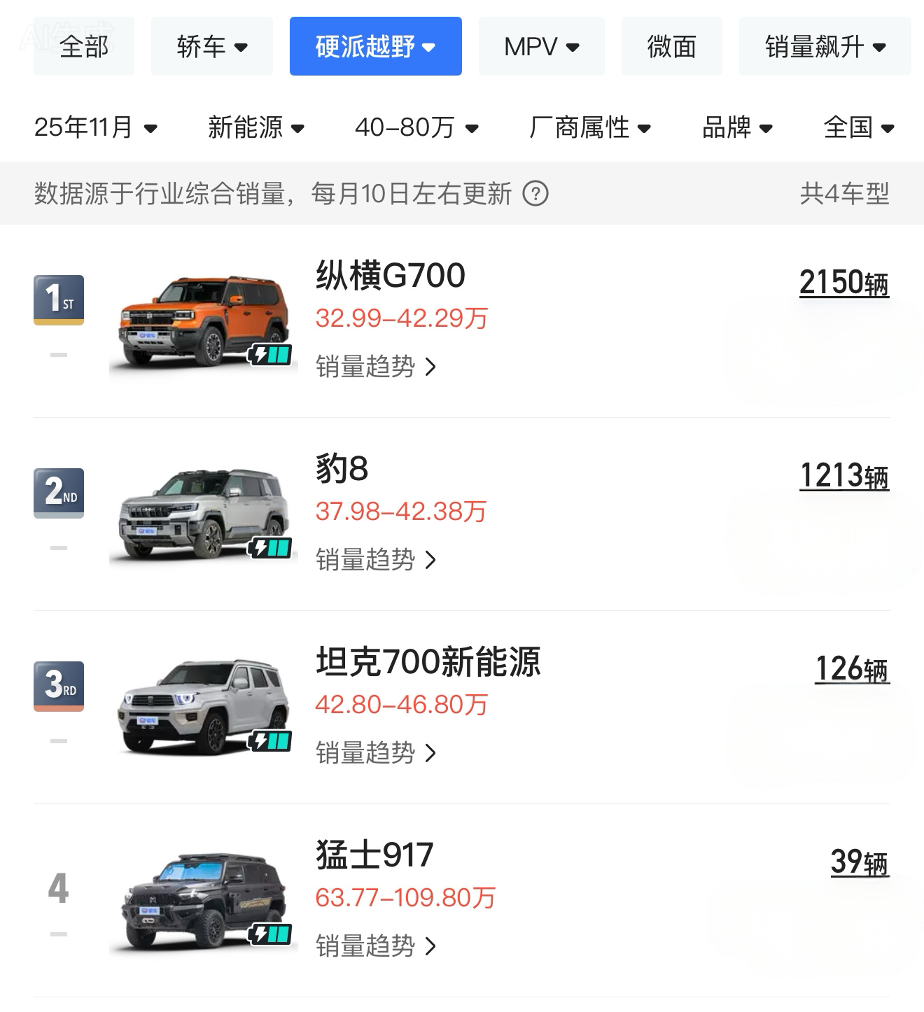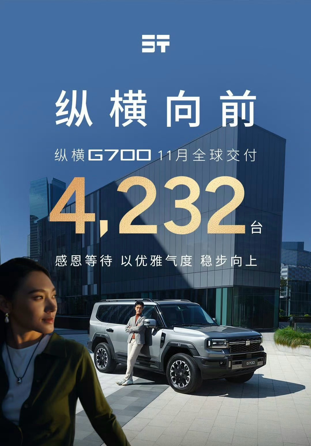 捷途纵横G700,顶配搭载华为乾崑智驾ADS 4系统,限时超级焕新价30.49万元起。这款车11月交出了不错的成绩单:全球交付4232台,其中国内交付2150台。在30-40万硬派越野赛道里,表现已经相当能打了。10月19日上市的,现在属于产能爬坡阶段,后续能看到更漂亮的数据!