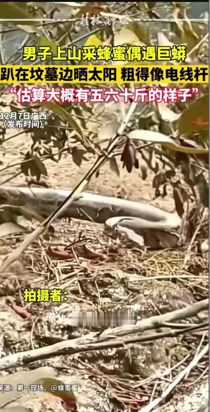 广西防城港惊现五六十斤巨蟒!男子寻蜜遇"晒太阳大拿",两米距离魂飞魄散 广西防城港的深山密林中,从不缺自然馈赠的惊喜,也藏着猝不及防的惊险。12月8日,当地张先生上山寻觅野蜂蜜时,就在山顶一处老坟旁的向阳平台上,与一条五六十斤重的缅甸蟒撞了个正着,这段惊魂邂逅的视频很快在网络上引发热议。 当日午后,防城港虽已入冬,但正午阳光透着暖意,正是野蜂活动的活跃时段。张先生循着蜂鸣穿梭林间,行至山顶坟茔附近时,眼角余光突然瞥见前方石台处卧着一团巨型黑影。定睛一看,竟是条浑身布满褐色云状斑纹的大蟒蛇,正舒展着比成年男子大腿还粗的躯干,惬意地沐浴阳光,身旁还藏着一处幽暗石洞,显然是它的藏身之所。 “当时离它也就两米远,浑身汗毛瞬间竖起来了!”张先生事后回忆仍心有余悸。他强压着颤抖,迅速掏出手机拍下视频——画面中,巨蟒黄白色的腹部紧贴地面,背部斑纹在阳光下若隐若现,全然不顾周遭动静,只顾着借助阳光提升体温,助力消化。短短几秒的拍摄后,张先生不敢有丝毫停留,蹑手蹑脚地转身撤离,直到跑出百米开外才敢大口喘气。 消防部门很快提醒,这条巨蟒应为国家一级保护动物缅甸蟒,虽无毒但缠绕力极强,其攻击半径可达自身长度的三分之一 。作为变温动物,即便冬季,只要气温适宜,它们仍会外出晒太阳补充能量 。专家解释,老坟旁的平台背风向阳、人迹罕至,且鼠类等猎物充足,正是蟒蛇青睐的“休憩宝地”。 这场意外邂逅,既是生态向好的佐证,也敲响了安全警钟。野外出行务必结伴而行,遇蟒时保持冷静,切勿挑衅或转身狂奔,应缓慢后退保持安全距离。你是否有过野外遇野生动物的经历?遇到巨蟒时你会如何应对?欢迎在评论区分享你的看法!野生巨蟒 巨蟒奇观 巨蟒出行