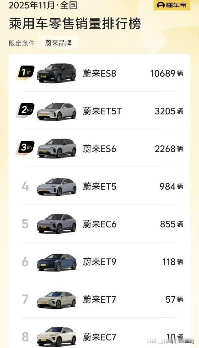 蔚来这销量结构也是蛮有意思的。 11月这一万八千多辆的销量中,其中三代ES8一款车就占了10689辆,除了ET9,基本就是蔚来品牌最贵的车了,毛利应该很喜人。 但ES8销量占比越高,也越说明2.5代5566当下不太好走量,记得之前李斌好像说过明年5566没有换代的计划,那26年怎么激活5566的销量也是个不小的问题,毕竟不能指望ES8一直保持破万的月销吧? 哦对,还有ES9,那就这两款大型SUV要一直扛起品牌的销量了…… 聊到这就不得不提蔚来的多品牌战略了,这个时候乐道和萤火虫的战略意义就又凸显出来,加上这两个品牌的车型,局面就又清晰多了……