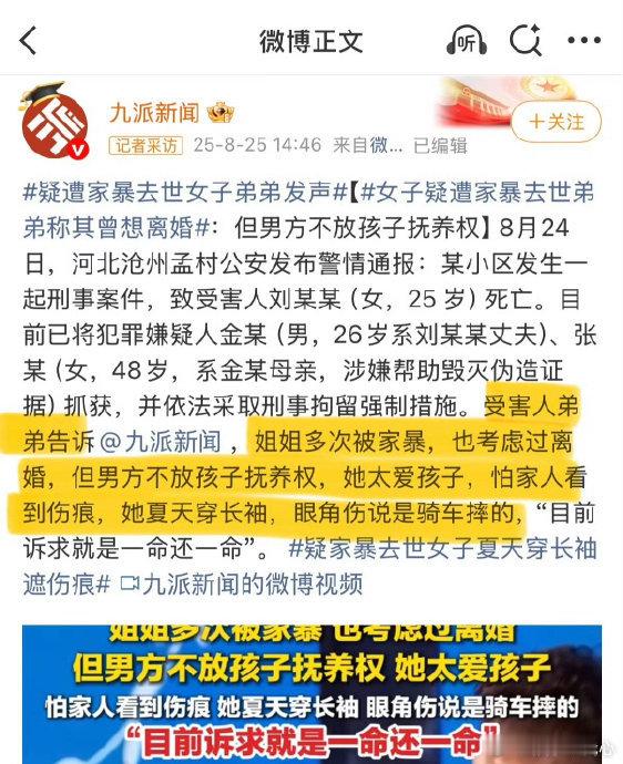 金昊婚后第13天就家暴妻子家,本应是温暖的港湾,是疲惫生活中的避风港。然而,近日一则令人痛心的消息打破了这份美好的期许:金昊在婚后第 13 天就对妻子实施了家暴。这一事件如同一颗重磅炸弹,在社会上引起了轩然大波,也让我们不得不重新审视婚姻中的暴力问题。家暴,并非新鲜话题,但每一次类似事件的曝光,都让人感到无比震惊和愤怒。据全国妇联的一项调查显示,在我国 2.7 亿个家庭中,约 30% 的妇女曾遭受过家暴,每 7.4 秒就有一位女性受到丈夫的殴打。这些冰冷的数据背后,是无数女性的痛苦和泪水,是一个个破碎家庭的悲哀。金昊在婚后短短 13 天就对妻子动手,这不禁让人发问:是什么让他在新婚的甜蜜期就露出了暴力的獠牙?是性格的缺陷,还是原生家庭的影响?又或者是婚姻中的矛盾没有得到妥善解决,从而引发了这场悲剧?心理学专家指出,家暴的根源往往是复杂的,涉及到个人的性格、心理、成长环境等多个方面。一些人可能由于性格暴躁、情绪管理能力差,在遇到问题时容易采取暴力手段来解决。而原生家庭的影响也不容忽视,如果一个人在成长过程中目睹了父母之间的暴力行为,很可能会在潜意识中认为暴力是解决问题的一种方式。此外,婚姻中的沟通不畅、经济压力、社会地位差异等因素也可能成为家暴的导火索。在金昊的事件中,我们不知道他们夫妻之间具体发生了什么,但可以肯定的是,家暴绝不是解决问题的正确方式。当遭遇家暴时,很多受害者往往会选择沉默和忍耐,担心家丑外扬,害怕影响孩子的成长,或者对施暴者还抱有一丝幻想。然而,这种沉默和忍耐只会让施暴者更加肆无忌惮,让家暴的恶性循环不断延续。专家建议,受害者在遭遇家暴时,要第一时间保护好自己的安全,可以选择向亲朋好友求助,或者拨打 110 报警。同时,要及时收集相关证据,如医院的诊断证明、报警记录、照片、视频等,以便在必要时维护自己的合法权益。此外,受害者还可以寻求专业的心理咨询和法律援助,帮助自己走出家暴的阴影。婚姻是一场两个人的修行,需要相互理解、相互尊重、相互包容。家暴不仅会对受害者的身体和心理造成伤害,也会对整个家庭和社会产生负面影响。我们每个人都应该树立正确的婚姻观和家庭观,尊重他人的权利和尊严,拒绝使用暴力解决问题。金昊婚后第 13 天就家暴妻子这一事件,为我们敲响了警钟。让我们共同努力,营造一个没有暴力、充满爱的社会环境,让每一个家庭都能成为温暖的港湾。愿每一位女性都能在婚姻中得到尊重和爱护,远离家暴的伤害。总结:金昊婚后 13 天家暴妻子的事件引发了我们对婚姻中暴力问题的深刻思考。家暴是一个严重的社会问题,其根源复杂多样。面对家暴,受害者不应沉默和忍耐,而应勇敢地采取措施保护自己。我们每个人都应该树立正确的婚姻观和家庭观,拒绝家暴,让爱回归家庭,让社会充满温暖与和谐。希望这样的悲剧不再发生,每一个家庭都能幸福美满。
