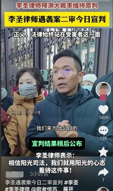 李圣律师被打的案子在北京朝阳某院开庭宣判,不出李圣律师的预料,法宣布维持原判。主犯王某晶判处有期徒刑一年九个月,其余三个人判处有期徒刑一年六个月。王某晶的的愿望实现了,她想早一点进监狱。 这才是真律师,李圣律师不畏强权,不恋金钱,为正义呐喊,为公平助威,为黑暗照明,为受害鸣冤 世上多魍魉,人间有钟馗! 李圣律师真是个硬骨头,看着他每天都情绪饱满斗志昂扬,真佩服他的干劲和他的正义感!他的勇敢,太令人佩服了,李圣律师有勇有谋,希望他健康,为正义而奋斗,为百姓为弱者发光! 地方上的权贵恶势力,钱贵恶势力,是当地普通人的噩梦! 当地人都是在恐惧中! 李律师,打击他们,普通百姓从心里叫好! 如果当律师的人不讲正义,那就是老百姓无处呜冤了,司法系统的腐败,那人们就失去灵魂了,希望多一点像李律这样的优秀律师!