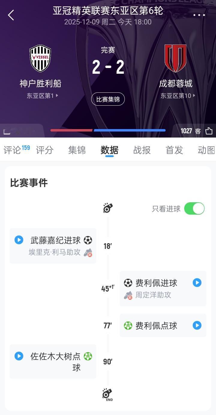 亚冠-蓉城2-2战平神户 费利佩梅开二度 12月9日,成都蓉城客场挑战神户胜利船。上半场,武藤嘉纪破门,费利佩补时世界波扳平比分;下半场,韦世豪传中造点,费利佩点射双响,佐佐木大树点球扳平。最终,蓉城2-2客场战平神户,蓉城积6分暂列东亚区第10位,神户积13分仍领跑