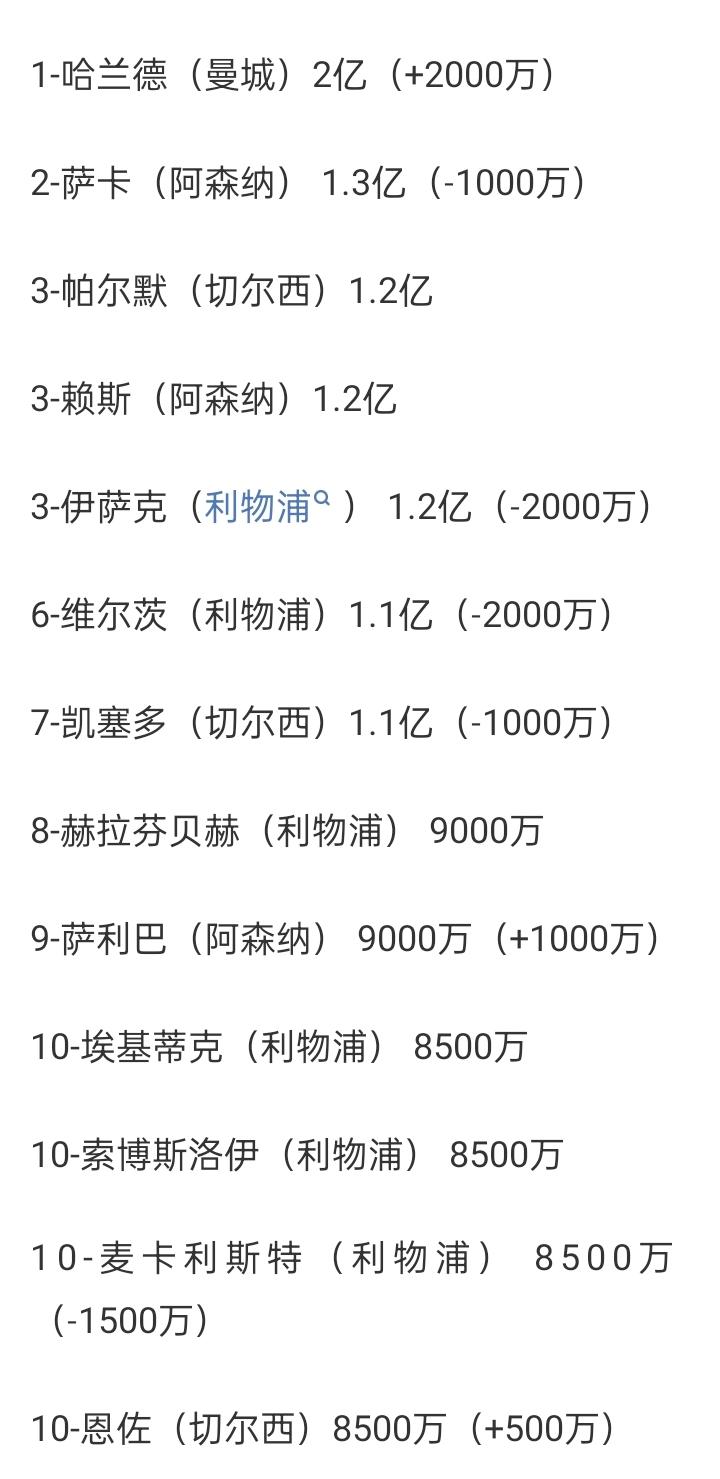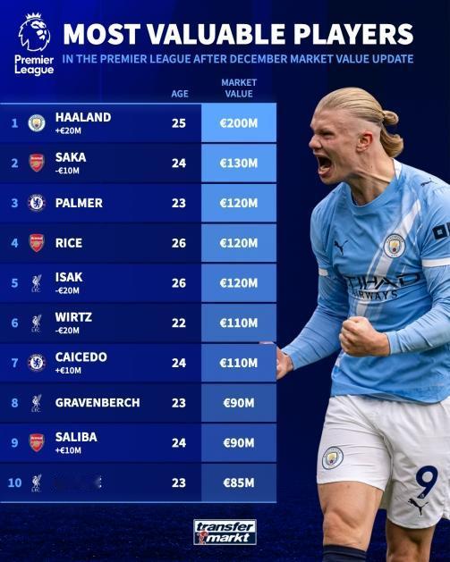最新英超身价前十:哈兰德2亿 伊萨克降至1.2亿 维尔茨降至1.1亿,麦卡降至 8500万 12月09日 德转更新新一期英超球员身价前十榜:哈兰德2亿居首,萨卡降至 1.3亿第二,伊萨克降至1.2亿,维尔茨降至1.1亿,麦卡降至 8500万