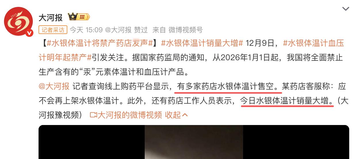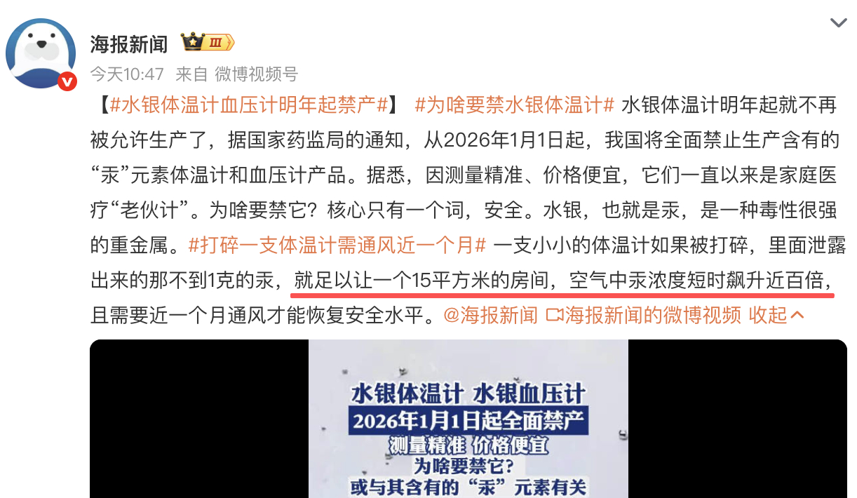 水银体温计血压计明年起禁产为啥要禁水银体温计 唉,有一个只要几块钱的家用检测设备要慢慢绝迹了;我们当然相信出这样的规定是好的,是降低水银这样一种金属对大家的安全危害。但是有两个小疑问:1、一只水银体温计的水银含量,其危害到底有多大?查了一下数据:1)一只水银体温计的水银含量大约是0.5~1克,而这个重量的水银,在常温(20-25℃)且通风条件良好的情况下需要1~2天时间才能全部蒸发完;而如果在一些密闭狭小空间,则可能需要数月。2)1克水银在挑高3米、面积15㎡左右的房间完全蒸发,会导致房间内水银气体浓度高达22.2 毫克 / 立方米,而安全标准则为0.01 毫克 / 立方米,也就是在这样的条件下完全蒸发可能会引起急性中毒。而头条热门贴的内容介绍的则是浓度瞬间扩大数百倍,这文科生的笔法也是的确厉害由此,要同时满足这些条件并造成毒害的可能性有多大,相信出台新政策的人是比较清楚的。2、现在的电子体温计,质量一言难尽,现在居然把事儿往消费者身上推说电子体温计不准往往是操作不当 了,某数码味儿太浓了3、电子的没电了得找电池,起码出台政策的先把比如充电式的搞定吧?要不然用那种传统电池,临时没电了还要去买。而水银的压根没这类问题,所以才能看到如图2的景象,老百姓不是傻子话又说回来了最近出台的标准、部分规定,怎么总感觉味儿不对啊,到底哪里出问题了?
