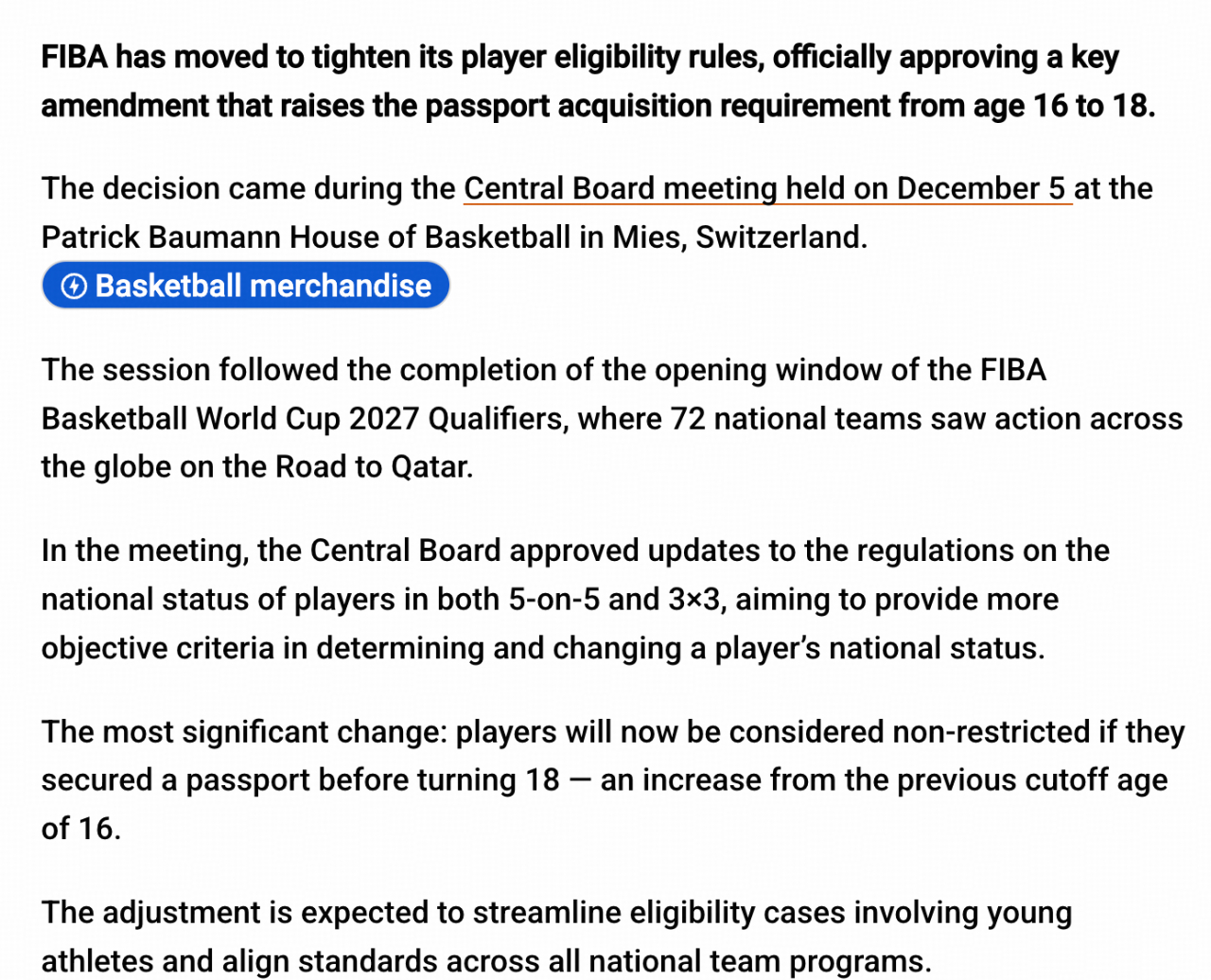 国际篮联这个规则改动,18岁前入籍不算归化。我估计亚洲最高兴的应该是菲律宾和一些西亚球队吧?搞球员变容易了。讲真,未来几年我们得加快发展速度了,不然再过几年,我们在亚洲层面就是直接对抗ncaa了。现在网上直播多,大家都去看看ncaa的水平,那是能轻易打赢的对手么?西亚、菲律宾包括日本,码人都是很有办法的。我们真的要抓紧时间了。金秋观赛季