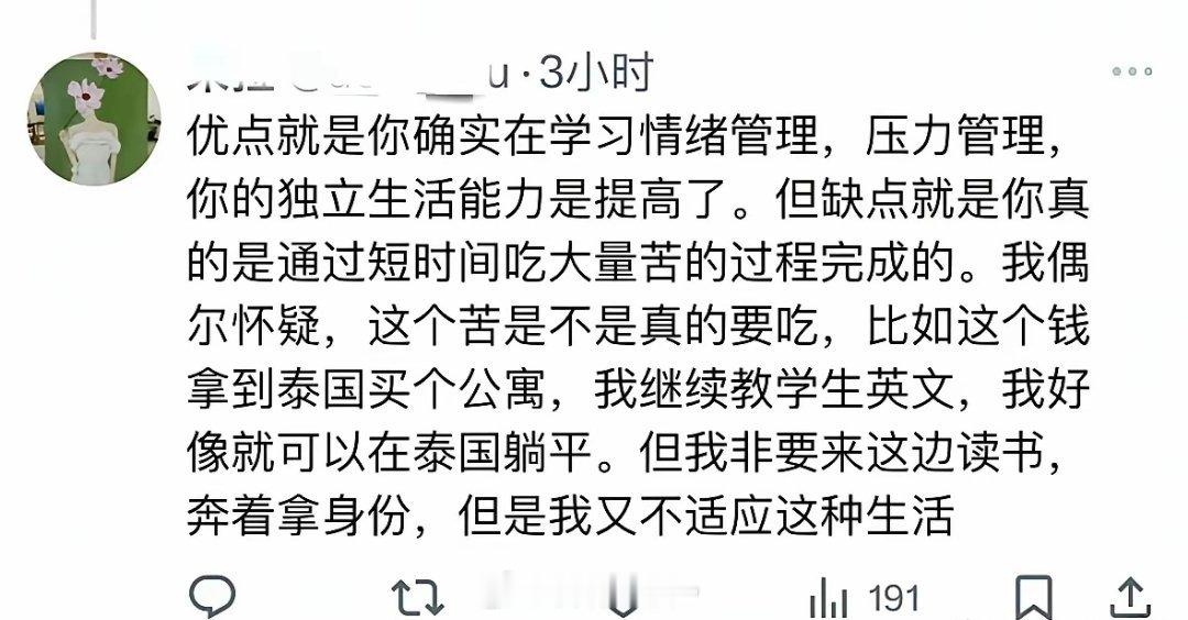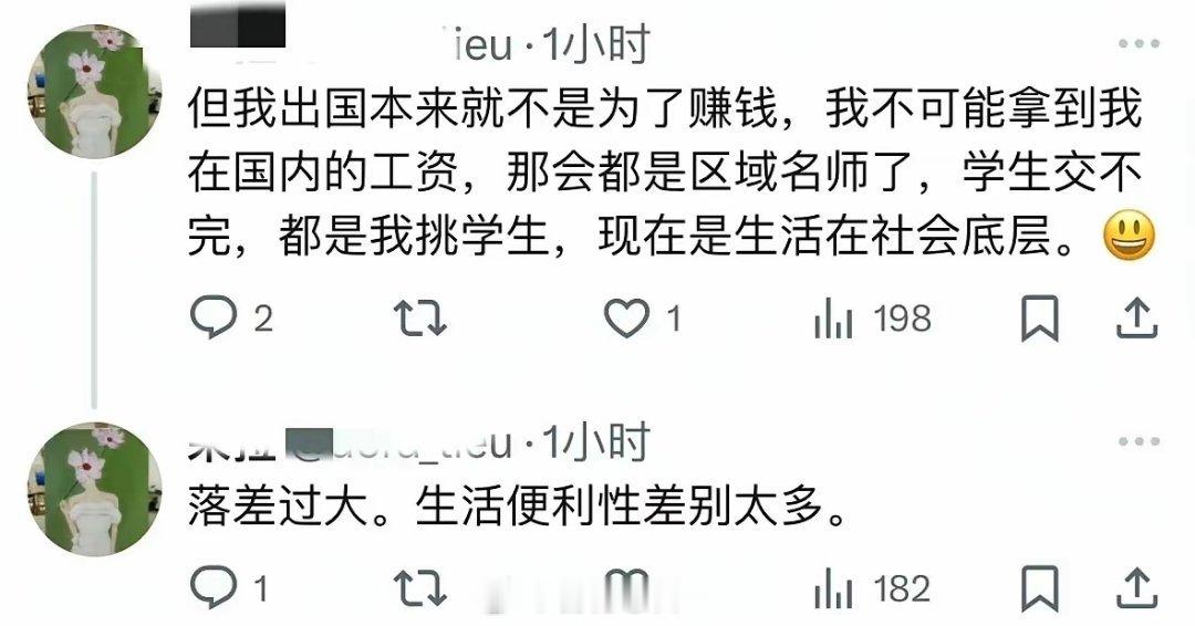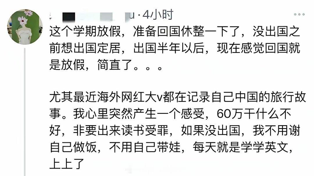 放弃国内年入百万的工作移民新西兰,变成社会底层,感叹在国内不用自己带娃,不用自己做饭,非要出国受罪!不过还是西方国家厉害,如果在国内有这么大的落差,它们肯定恨透了这个社会,把原因全都怪到环境不好,然后就会上升到制度不好,文化不好,人种不好,反正国内一切都不好,但是去到国外面对这么大的落差,它们学会了情绪管理,压力管理,并没有怨天尤人,也没有怪环境不好,因为它们怪了,人家老外也不会理它们,它们这群自找苦吃的华人,对于老外说可有可无!