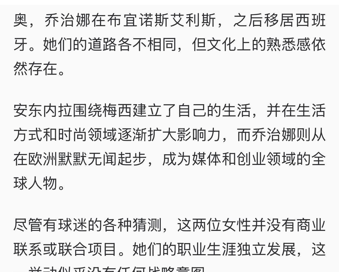梅西妻子安东内拉在社交媒体上分享了庆祝迈阿密国际夺冠的照片,C罗情人乔治娜给她点了赞,引发球迷讨论: 乔治娜晚上会第47次身穿阿根廷10号球衣,要遭老罪了。 玩笑归玩笑,都是阿根廷女人,也是足坛最有名的球星伴侣,她们俩在社交媒体上互动一下,实属寻常。希望阿韦罗别那么小心眼,又要体罚乔治娜,逼问谁更强。