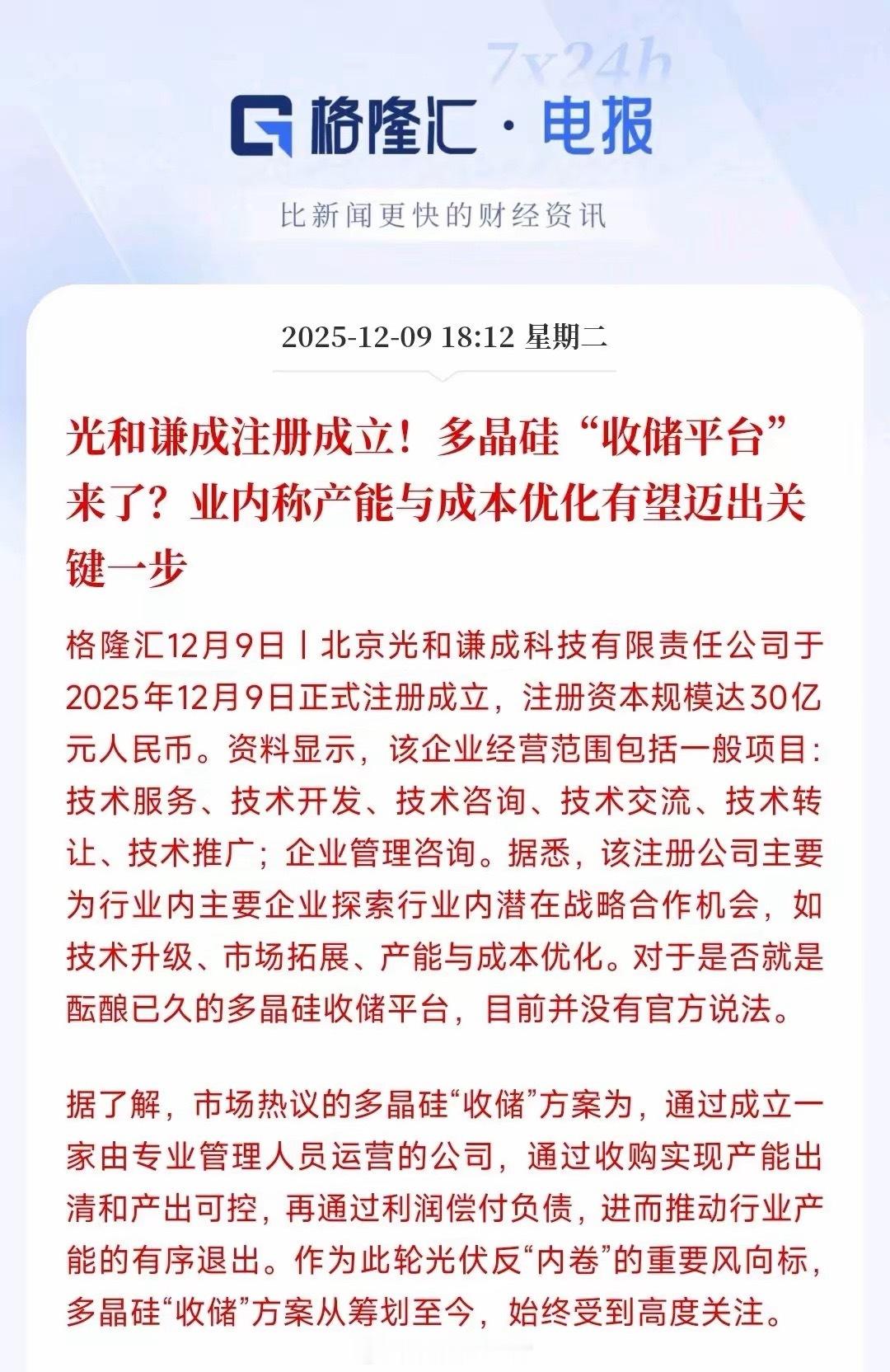 光伏重磅!多晶硅收储落地倒计时?新公司成立引爆板块,明天或迎主升浪光伏行业反内卷重拳出击!光和谦注册成立,市场一致猜测其为多晶硅收储核心主体,行业收储工作正式迈入实操阶段。这波操作直击行业痛点——收储将直接锚定多晶硅价格中枢,主流报价有望稳定在6万元/吨以上,彻底扭转价格内卷局面,企业盈利预期瞬间拉满!敏锐资金早已抢先动手:今天下午光伏板块直线拉升,消息落地当日多晶硅期货主力合约已大涨3.45%,散户还没反应过来,先手资金已经吃肉!筹备消息就足以提振市场信心,如今关键主体落地,光伏板块明天大概率扛起领涨大旗,一波强势反弹行情蓄势待发!