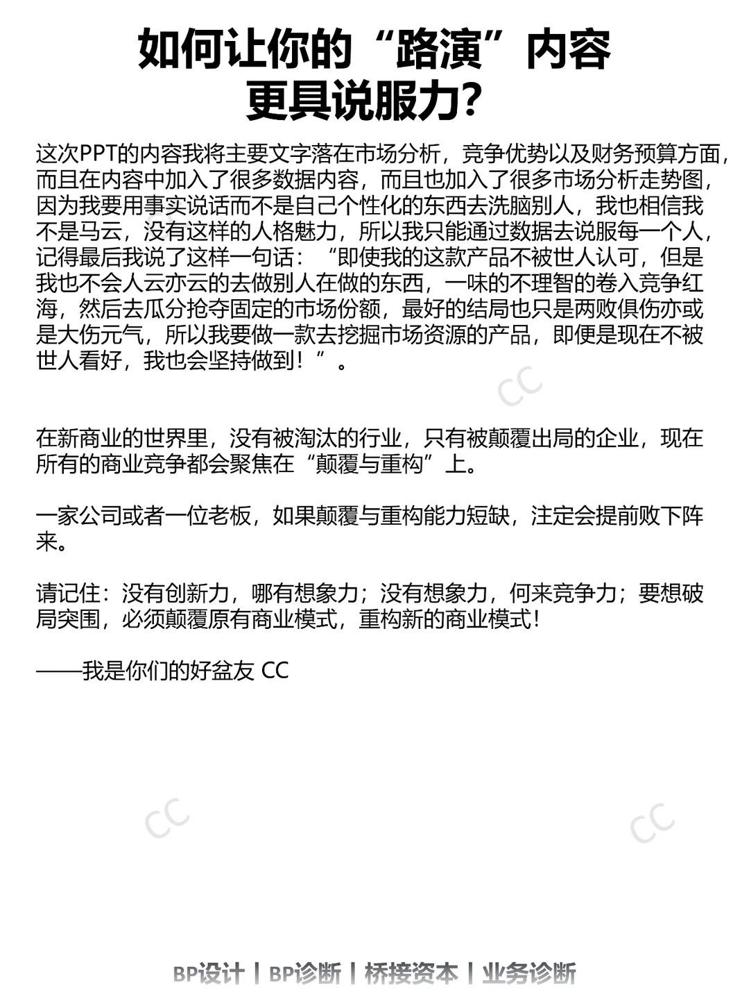 今天通过CC的亲身经历来谈谈“路演”的窍门,以便让自己的路演演讲更具出众和更加具有说服力!