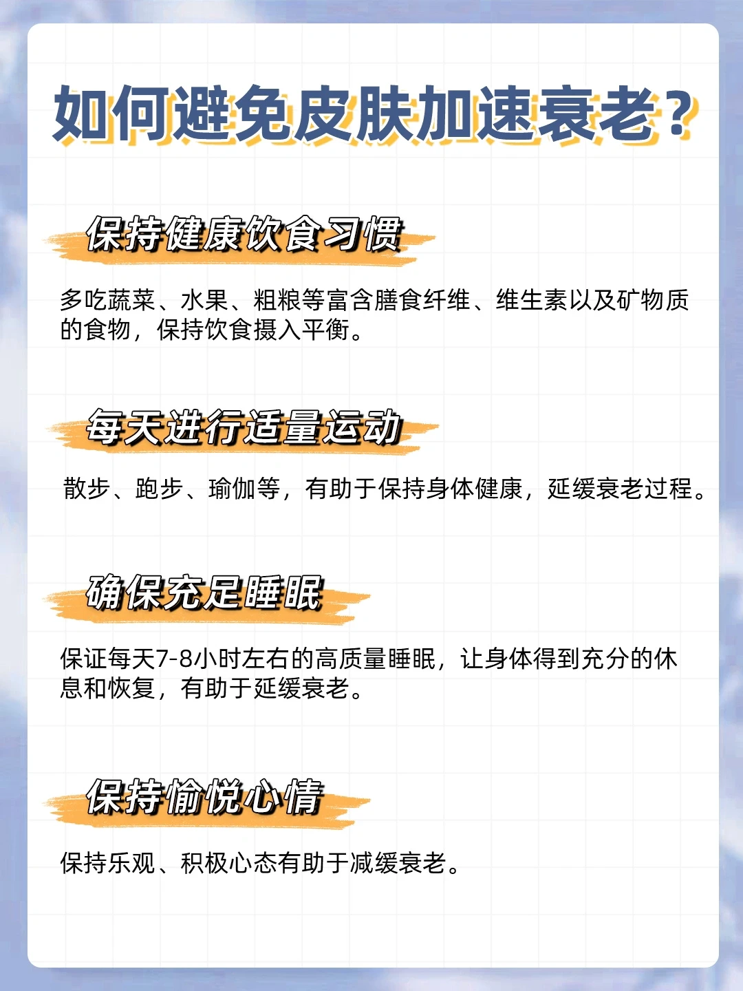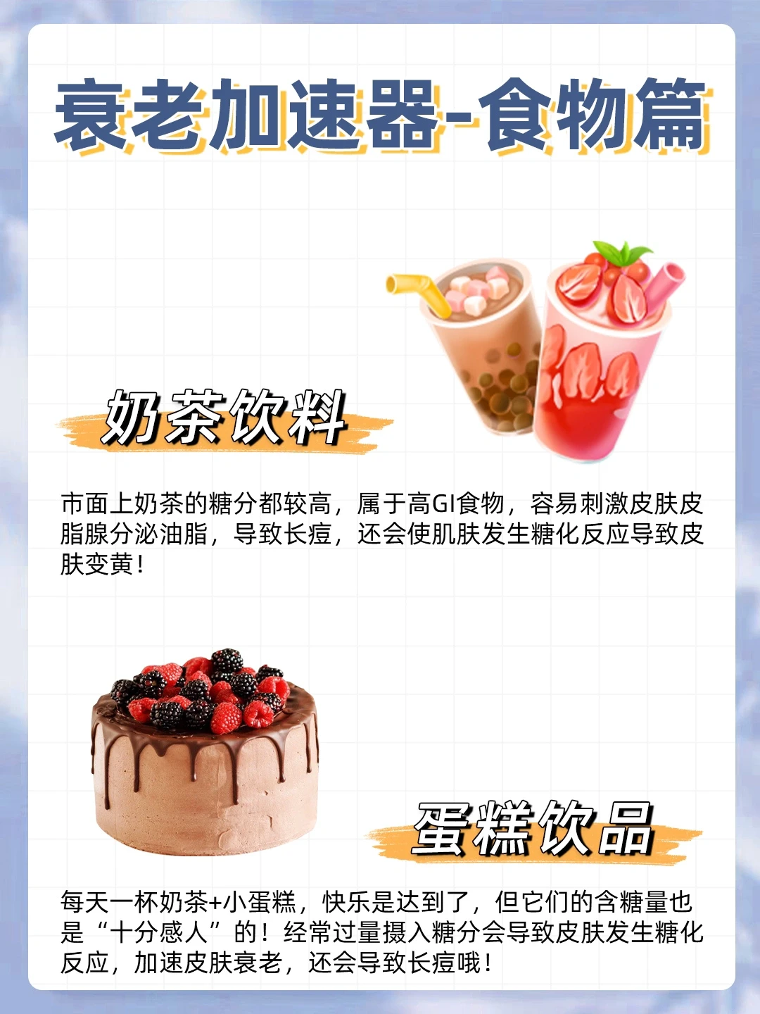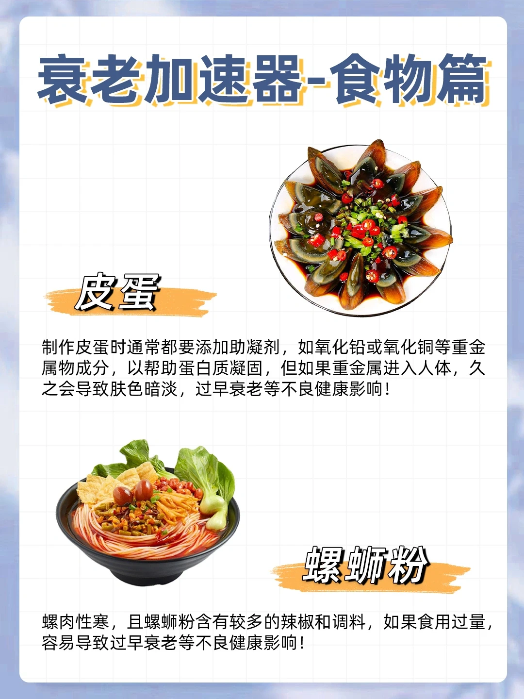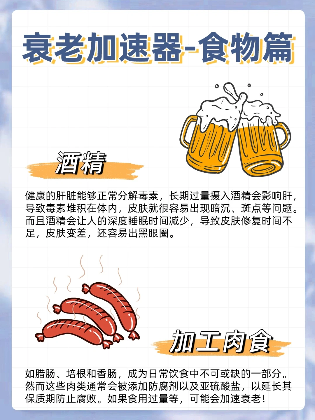 惊[石化R][石化R]吃了会让人加速衰老的食物‼️ 📝很多人会在护肤品上花大价钱,却忽略了饮食的重要性[失望R]。日常管不住嘴不仅会导致发胖,还有可能让你老的更快!如果想老的慢一点,建议远离这些食物和习惯哦❗️ 快看看这些会导致皮肤加速衰老的“刺客元凶”你都占了几个? 1️⃣ 油炸食品🍗 2️⃣奶茶饮料🥤 3️⃣蛋糕甜品🍮 4️⃣酒精🍻 5️⃣皮蛋 6️⃣螺蛳粉 7️⃣加工肉食 8️⃣高盐食物🥵 9️⃣熬夜追剧、玩手机 🔟不爱涂防晒 1️⃣1️⃣爱生气 1️⃣2️⃣过度劳累