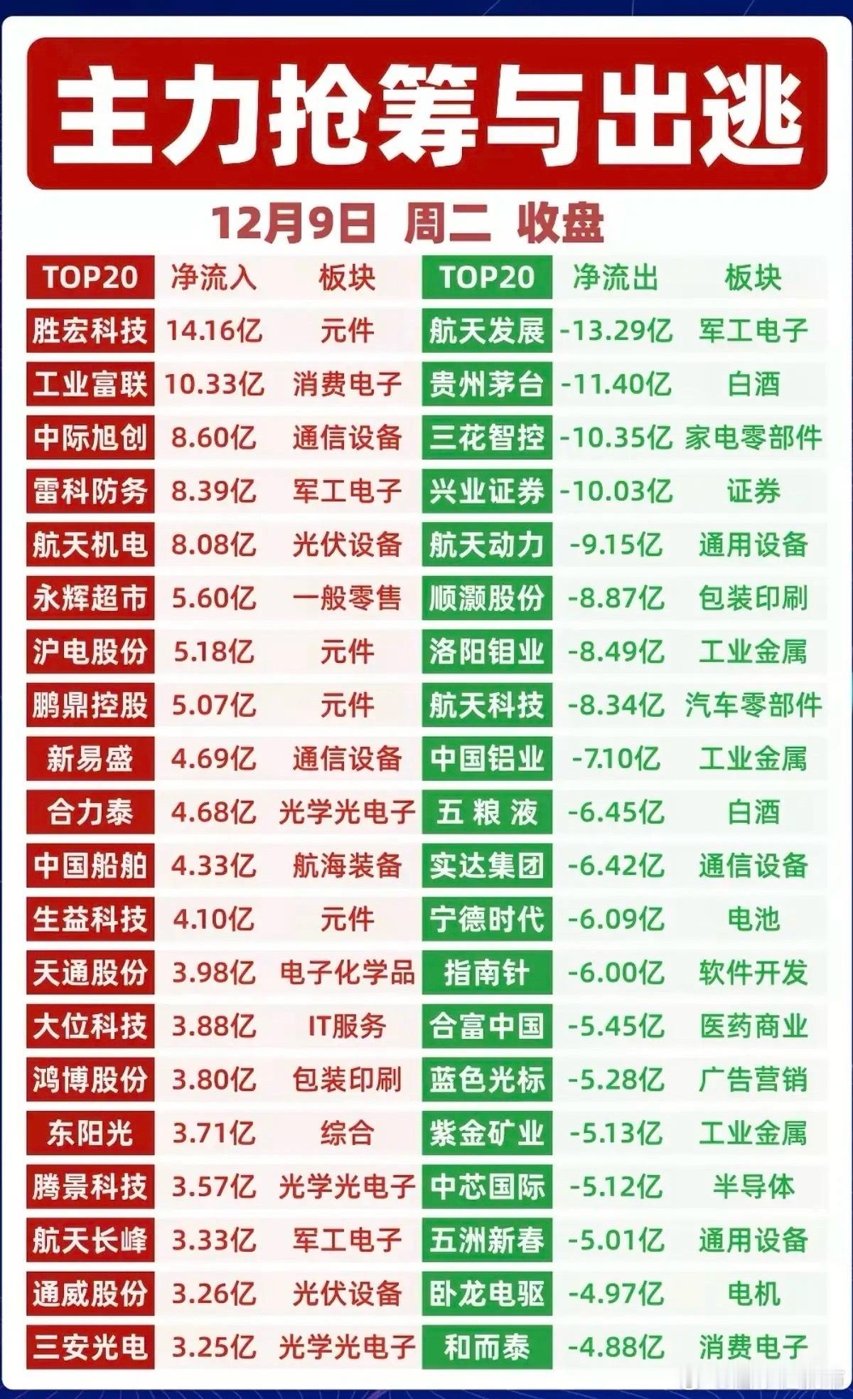 12.9周二 收盘 主力大资金 抢筹监测!1.光学光电子,资金抢筹2.军工电子,3.通信设备4.光伏设备5.电子元件