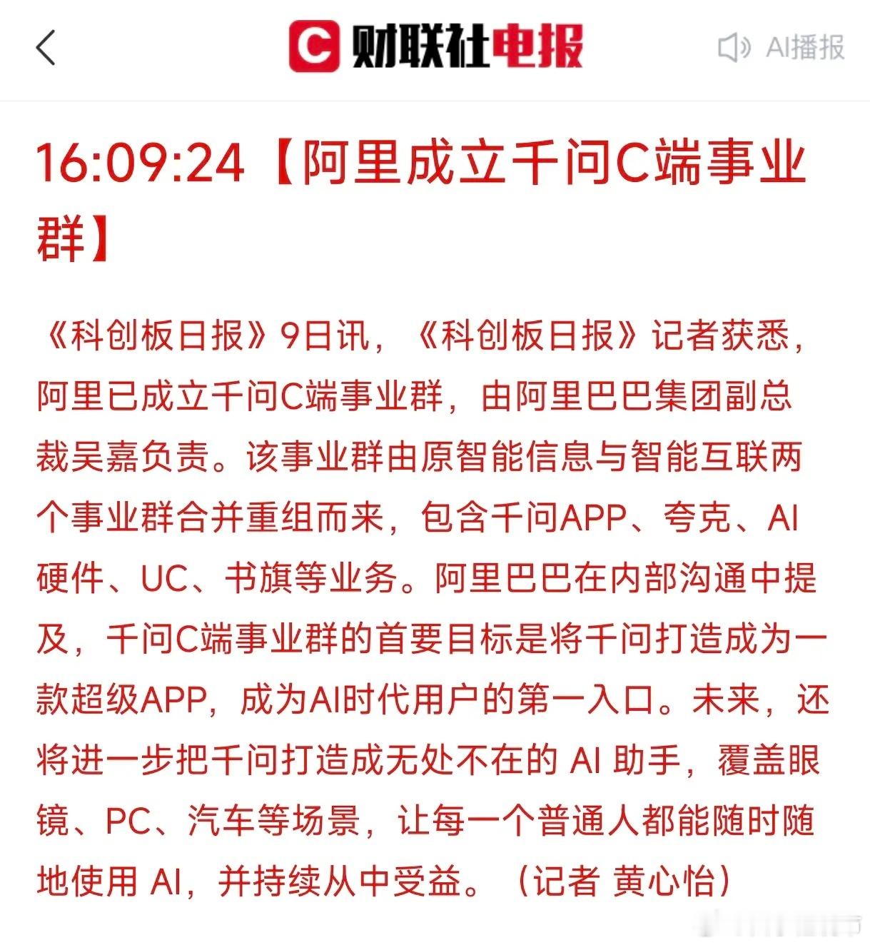 人工智能今天逆势上涨后,阿里宣布!9号盘后人工智能利好不断,阿里巴巴成立千问C端事业群,整合千问APP、夸克、ai硬件、UC、书旗等业务,意图打造一个人工智能时代的“超级软件”!这不仅是阿里的野心,也代表了一个重要的趋势,就是AI应用从理论走向实际商业化的重要步骤。过去一段时间人工智能板块的市场炒作重心都在AI硬件算力基础设施上,带动了CPO等细分板块的高速发展,现在的位置已经很高了,再往上的空间有限。而AI软件商业化才刚刚开始,位置也比较低,未来获得更多资金关注是非常有可能的。当然过去一段时间AI硬件表现出色是因为容易出业绩,而软件目前还处于投入大于实际收益的阶段,而且竞争激烈,商业化前景不够明朗,都是市场担忧的点。总之,阿里迈出了第一步,接下来可能会有更多国内公司跟进,毕竟市场占位置比较重要!