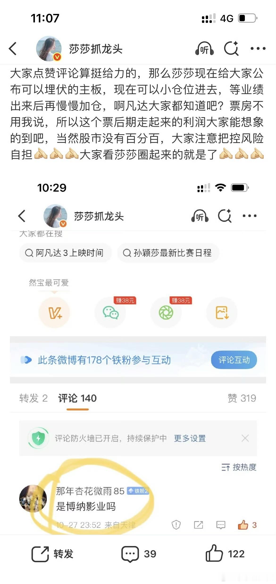 最近很多人问我博纳影业还能进吗?特别是有些还是关注莎莎几个半年以上的,你们不觉得