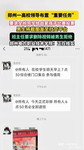 高校领导让学生给自家孩子投票?郑州这波操作把学生看懵了! 12月9日,郑州电力职业技术学院一班主任在班级群里布置“重要任务”,要求全班学生为领导家孩子的比赛投票,还叮嘱“有平台的都发布,赶快动起来”。 一名男生将聊天截图发至社交平台后,班主任要求其删除视频,男生态度坚决:“我不删视频,不可能删的!” 针对此事,学校宣传科表示正在核实。让学生为私人事务“集体投票”,既违背校园公平原则,也难免让学生心生反感,希望学校能尽快给出公正透明的处理结果。