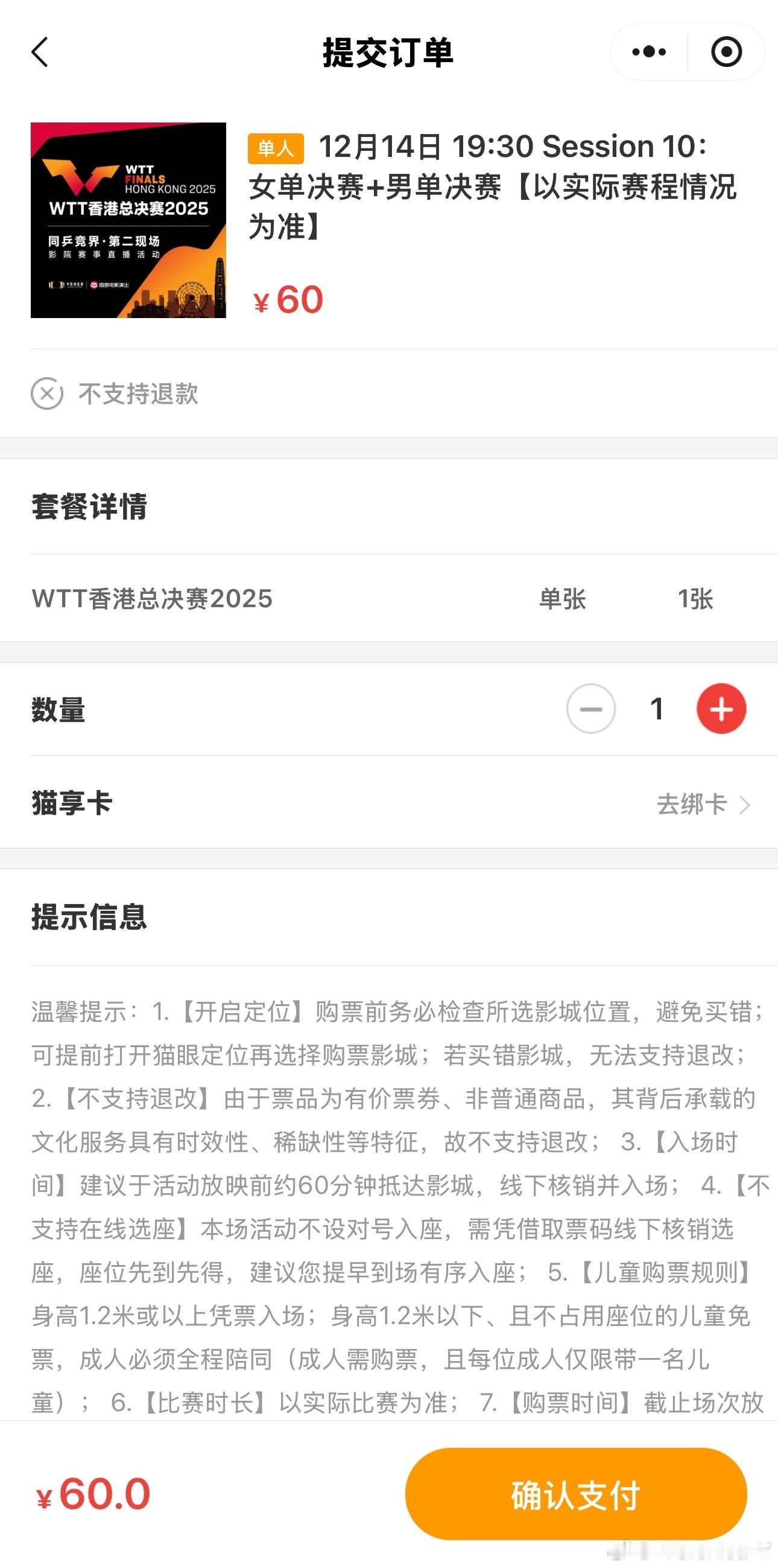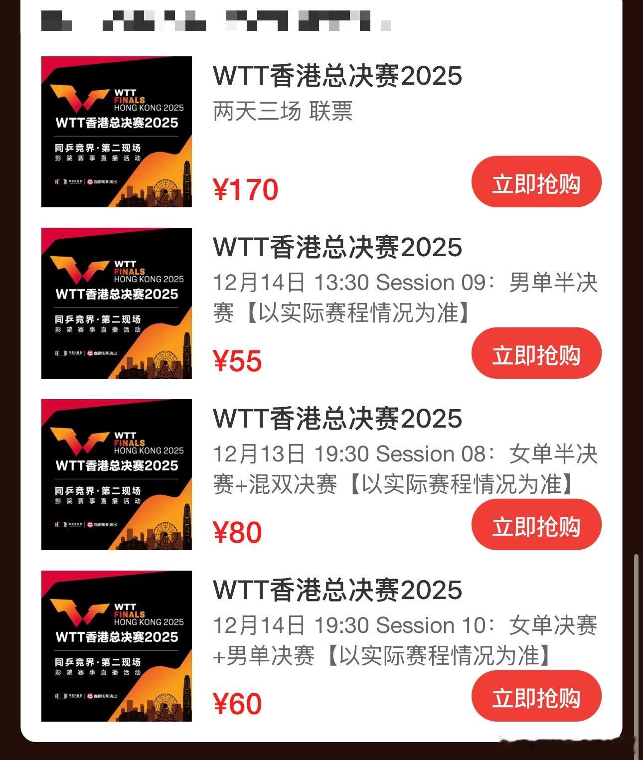 一共有3个场次的比赛可以去电影院看12.13 19:30 女单半决赛➕混双决赛80元12.14 13:30 男单半决赛 55元12.15 19:30 男女单打决赛 60元我买了决赛的票 希望能开到“大奖”