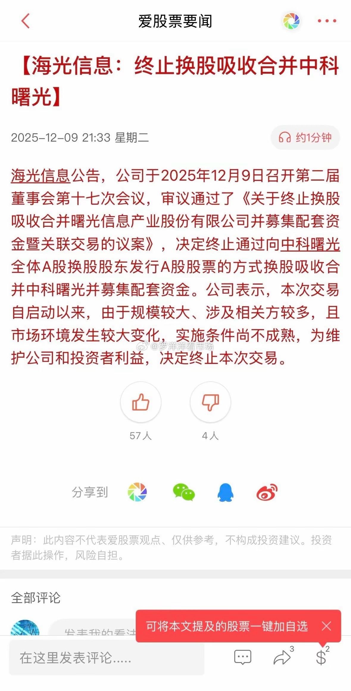 晚间第一利空:海光信息终止换股吸收合并中科曙光的消息,本质是市场环境变化下的理性选择,对双方及行业的影响可从以下维度拆解:一、终止原因:“规模+环境”双重约束此次合并是A股首例“子公司反向吸收母公司”的千亿级算力产业链整合,原计划打造“芯片+服务器+算力服务”的全链条巨头,但终止核心源于两点:1. 交易复杂度超预期:涉及双方股权、业务、监管审批(如反垄断)等多环节,且同属“中科系”的关联交易需协调多方利益,耗时远超预期;2. 市场环境生变:从5月筹划到12月,半导体板块估值回调(海光PE从147倍降至当前约100倍)、美国对华芯片限制升级(如H20芯片出口新规),叠加节前资金避险情绪,合并后的“估值重构+协同成本”性价比下降。二、对两家公司的影响:短期冲击有限,长期逻辑分化1. 海光信息(芯片端)• 短期:避免了“高估值换股+毛利率稀释”的压力(原合并后毛利率将从63.7%降至39.3%),但失去了中科曙光的服务器渠道协同,可能影响DCU芯片的商业化落地速度;• 长期:需独立承担研发投入(原计划配套募资用于芯片互联技术),但专注芯片主业反而能聚焦x86架构自主化(摆脱对AMD授权依赖),若后续获得政策资金支持,逻辑更聚焦。2. 中科曙光(服务器端)• 短期:无需注销上市地位,保留独立融资能力,且与海光的产业合作(如服务器搭载海光芯片)不受影响,生产经营基本稳定;• 长期:失去了“绑定核心芯片供应商”的护城河,需重新平衡与龙芯、华为昇腾等芯片厂商的合作,服务器业务的自主可控性略有削弱。三、行业信号:算力产业链整合“降温”,回归商业本质此前市场期待此次合并成为国产算力“对标英伟达”的标志性事件,但终止传递出产业链整合并非“越大越好”的信号:• 国产算力竞争已从“规模扩张”转向“技术+盈利”:华为昇腾凭借79%的智算中心份额形成生态壁垒,海光+曙光的合并更多是“补链”,而非“破局”;• 监管与市场更理性:高估值并购的“协同预期”需让位于实际盈利能力,此次终止也避免了合并后可能出现的“文化冲突(研发导向vs销售导向)+客户流失”风险。总结:换股合并终止意味着对于这两家公司短期来说肯定都是利空。因为毕竟之前合并这两家公司涨幅也非常的多。从短期来看,大家务必要规避算力服务器这个方向。有没有朋友持有这两家公司的?你觉得明天的走势会怎么样呢?