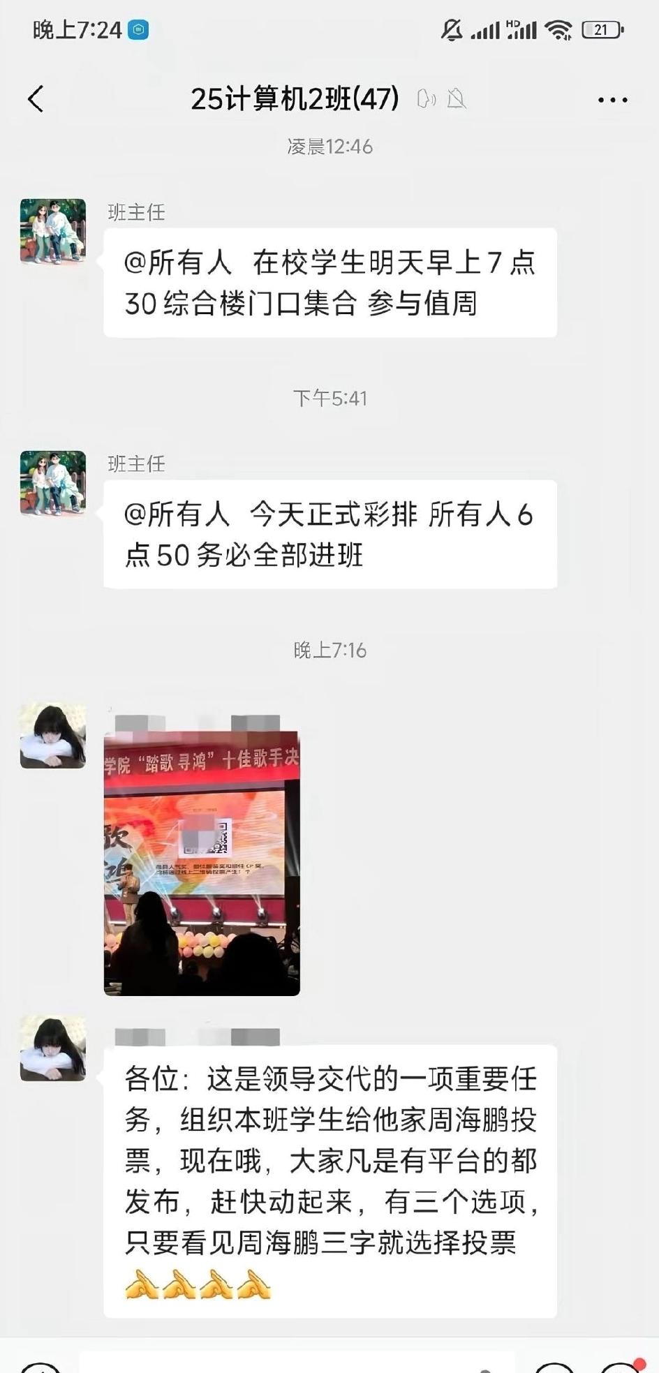 12月9日,郑州一高校领导布置“重要任务”,要求全班同学给自家孩子比赛投票,男生