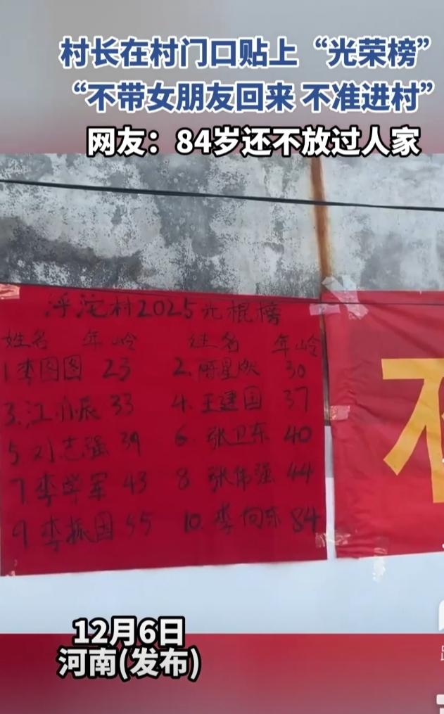 年关将至,许多人估计有家不能回了。 村口墙上已拉起了横额,不带女朋友回来,不准进村。 还列出了光棍名单。 看来,这回是动真格了。 村委会也是为光棍们操碎了心,不得不出此下策。 可是,在村口拉横额,还解决不了光棍问题。光是热心还解决不了问题,还得另外多想想办法。 只是,有光棍都84岁了,还要逼他返老还童,娶媳妇回家,这也是强人所难。