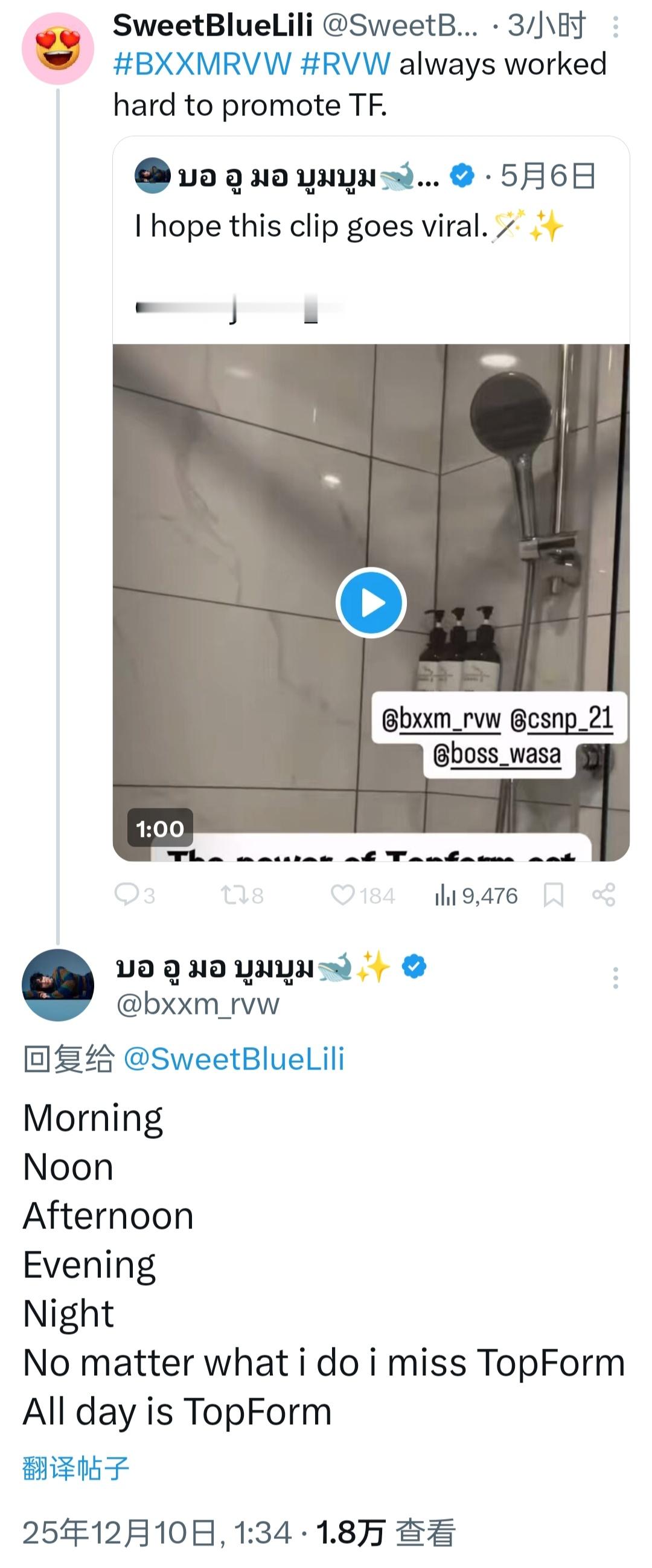 251210有个粉丝转发了Boom以前发的《Top Form》相关的帖子,配文“Boom一直努力宣传《Top Form》”然后Boom评论“早上、中午、下午、傍晚、深夜,无论我在做什么,都在想念《Top Form》,一整天都在想《Top Form》”