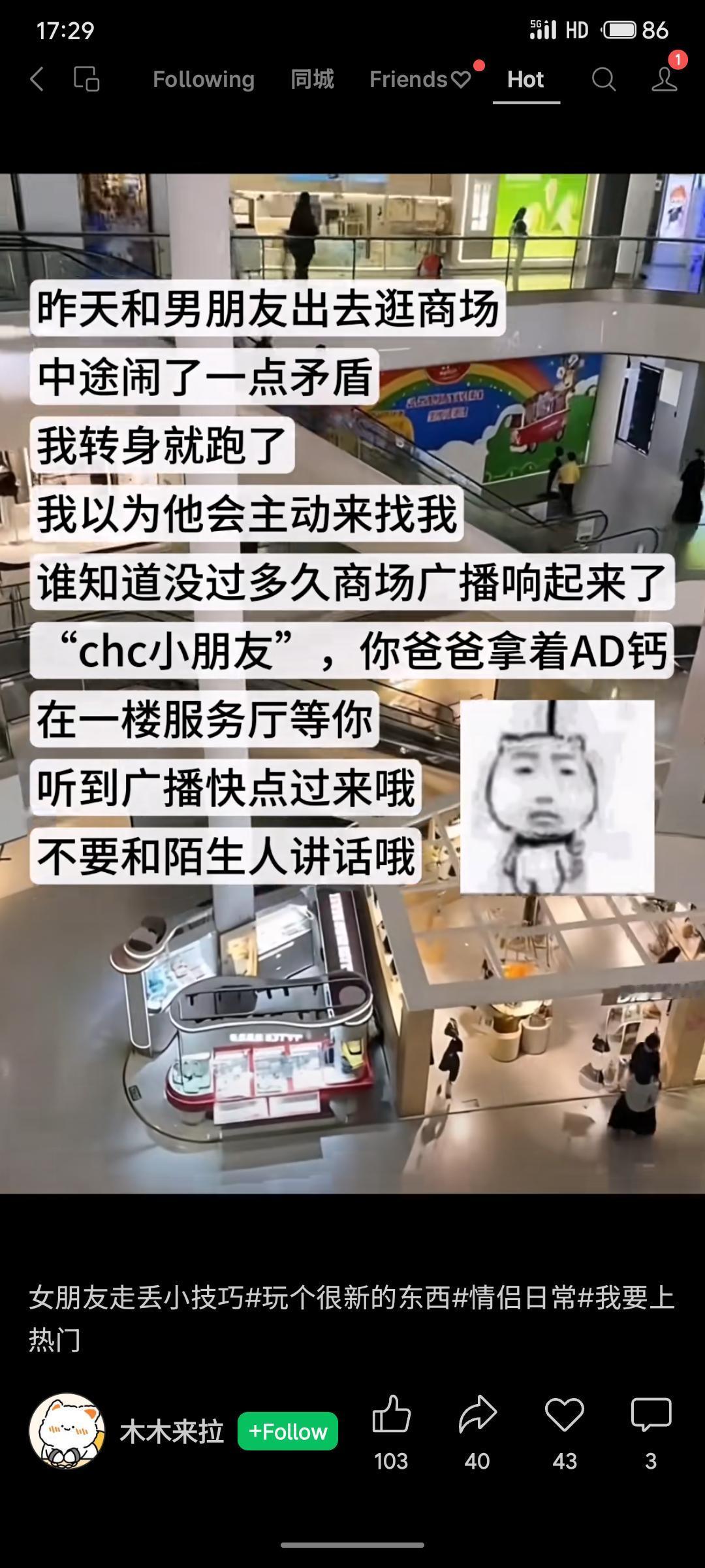 情侣商场闹矛盾,女友赌气跑开。男友未直接寻找,而是通过商场广播幽默寻人:“小朋友,你爸爸拿着AD钙奶在一楼等你”。以轻松方式化解了尴尬,展现了情侣间的小情趣。