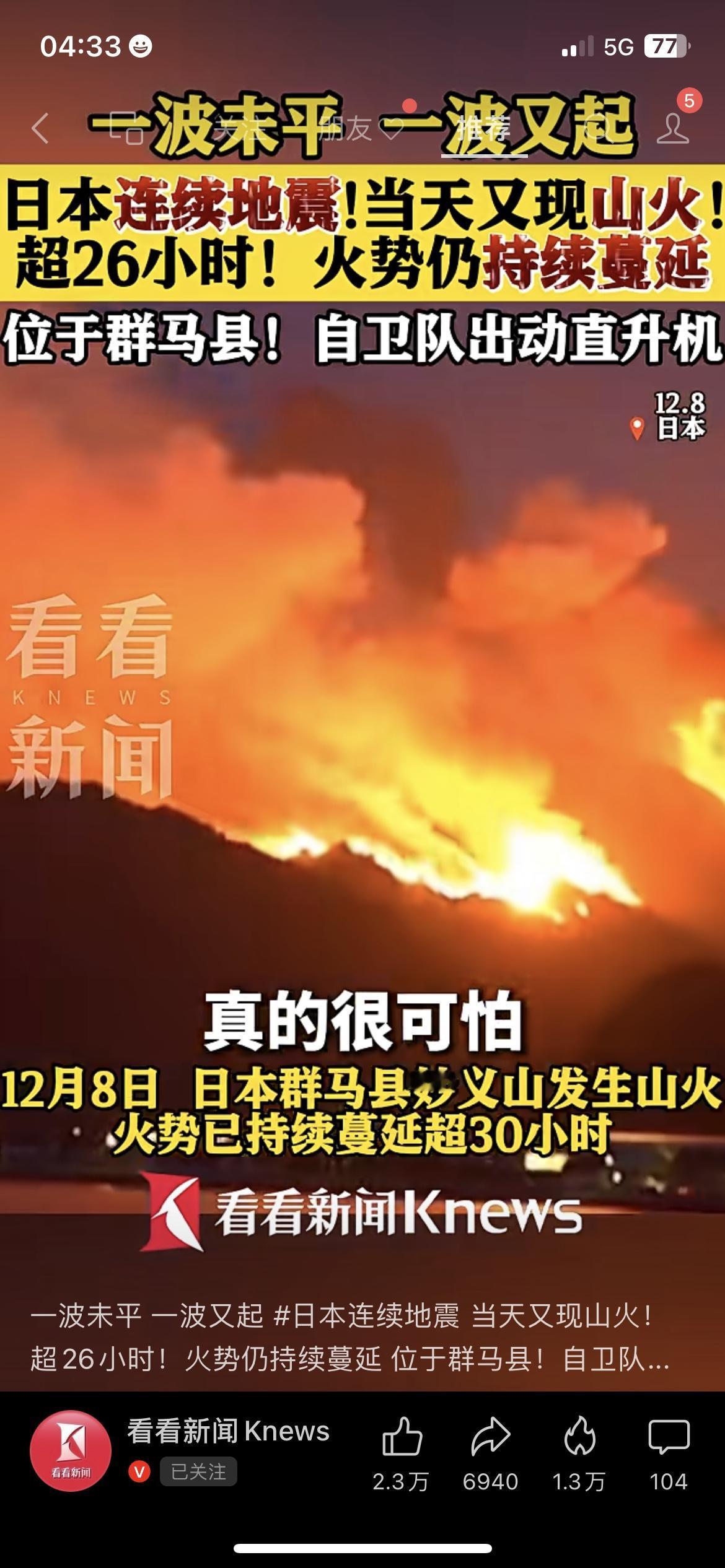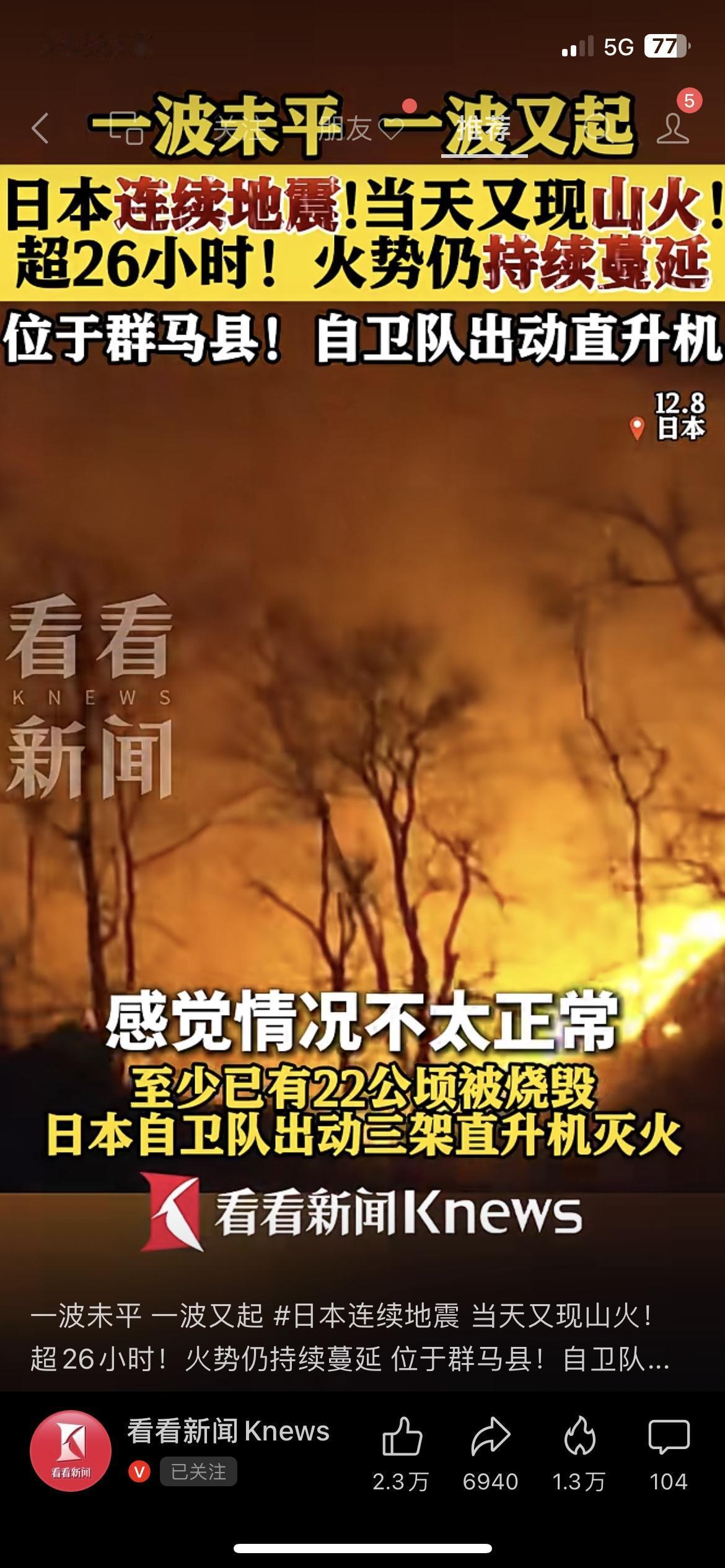 日本这波“祸不单行”:地震刚完又闹山火,烧了30多小时还没灭 日本这几天是真难:刚震完7.5级强震,群马县又起山火,烧了30多小时还在蔓延,自卫队都出动直升机了。 看视频里火光冲天的,当地居民说“火势蔓延得特别快”,这灾接着灾的,看着都揪心。 希望那边能快点把火灭了,少出点事儿吧~你们那边最近天气稳吗?评论区报个平安~