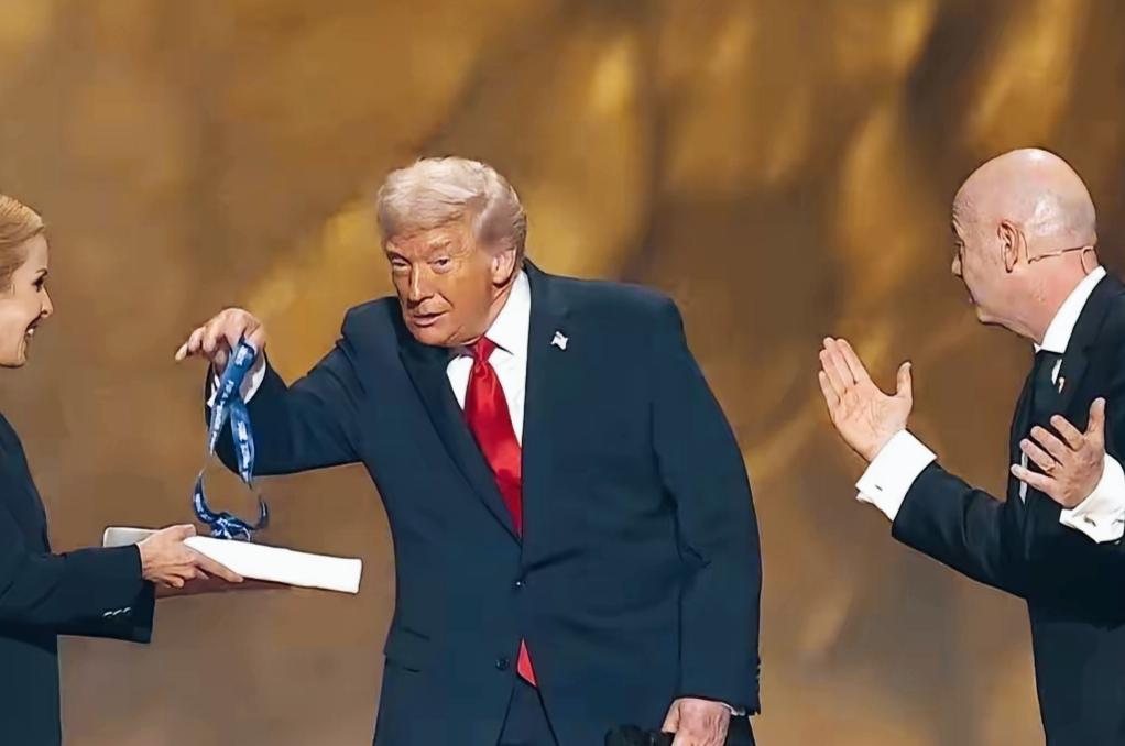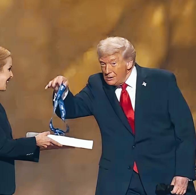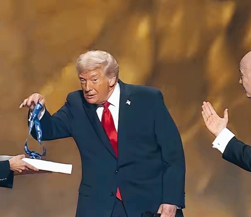 特朗普这面部表情是什么意思呢? 特朗普手拿奖牌的姿势,是不是挺特别啊! 这是着急自己抓紧戴上吗? 一旁的因凡迪诺是不是有点惊讶啊?
