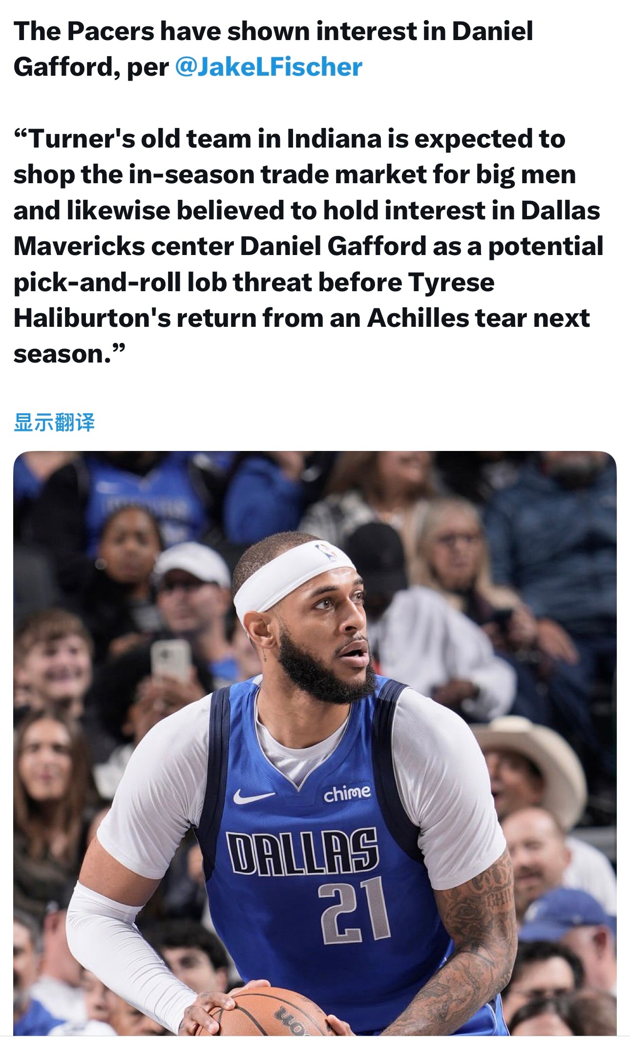 Jake Fischer:步行者有意加福德。“特纳的老东家步行者预计将在赛季中期的交易市场上寻找内线球员。外界也认为,在哈利伯顿下赛季跟腱撕裂伤愈复出前,他们有意独行侠中锋加福德,将其视作挡拆空接威胁的潜在人选。”