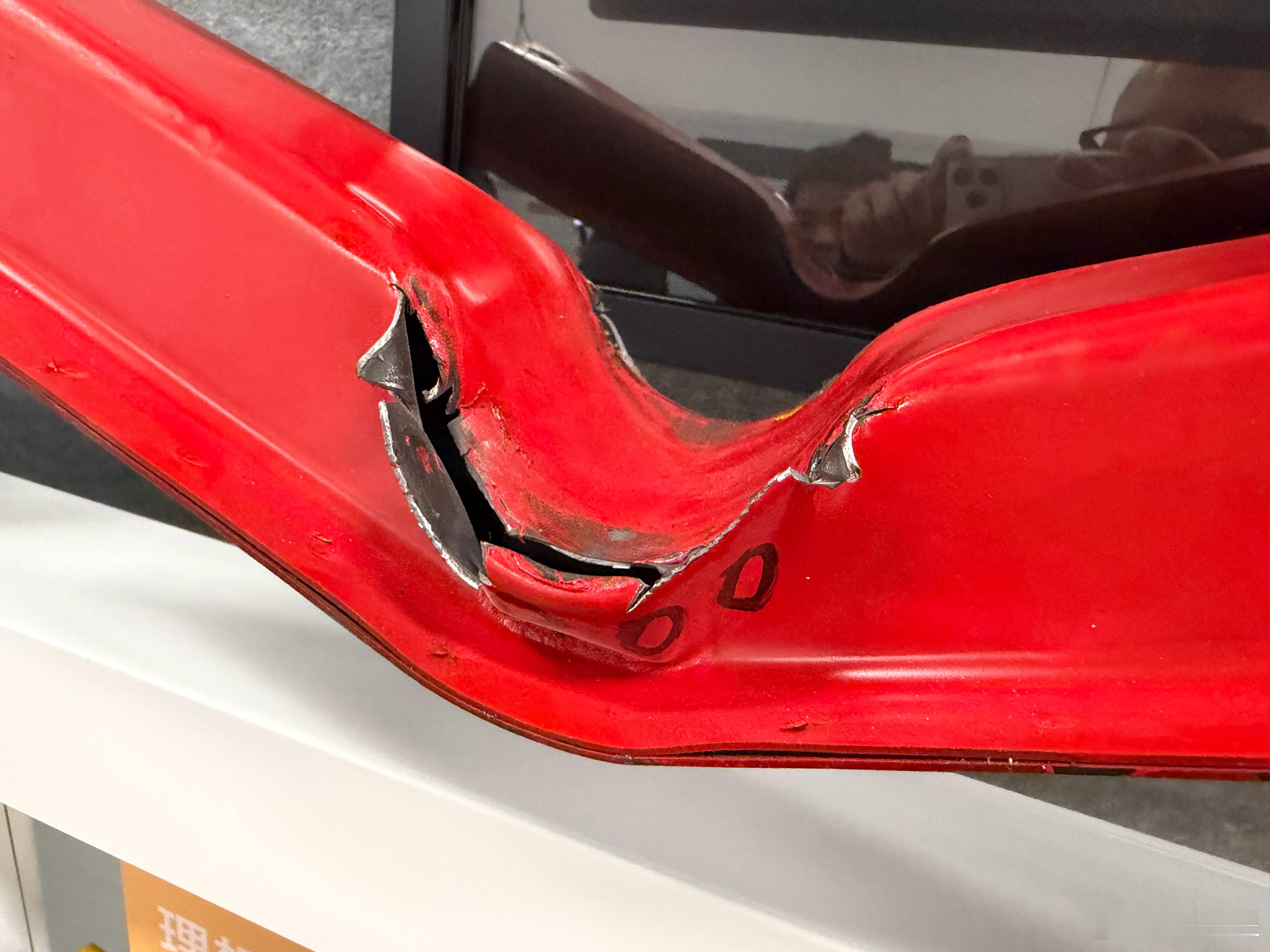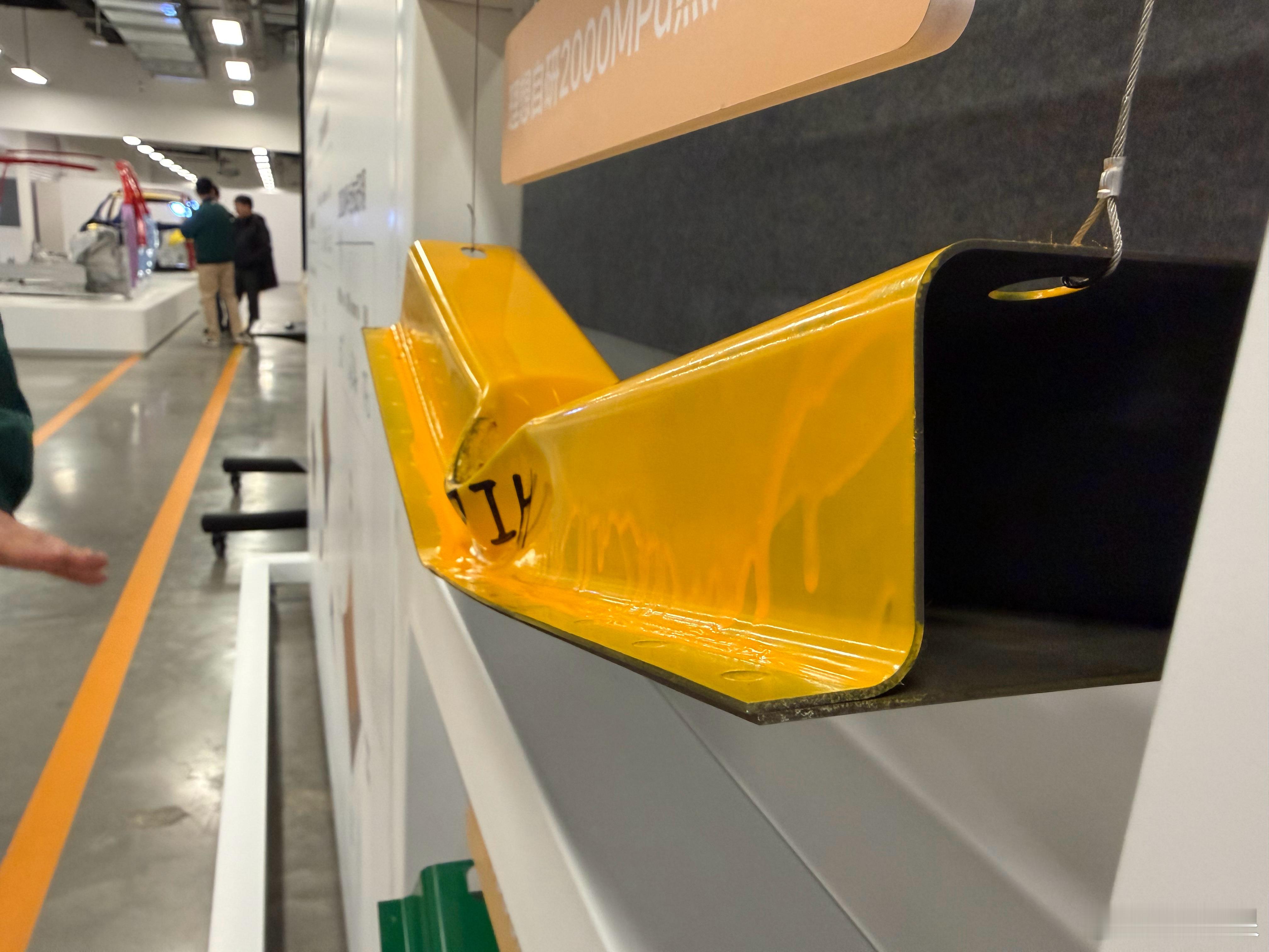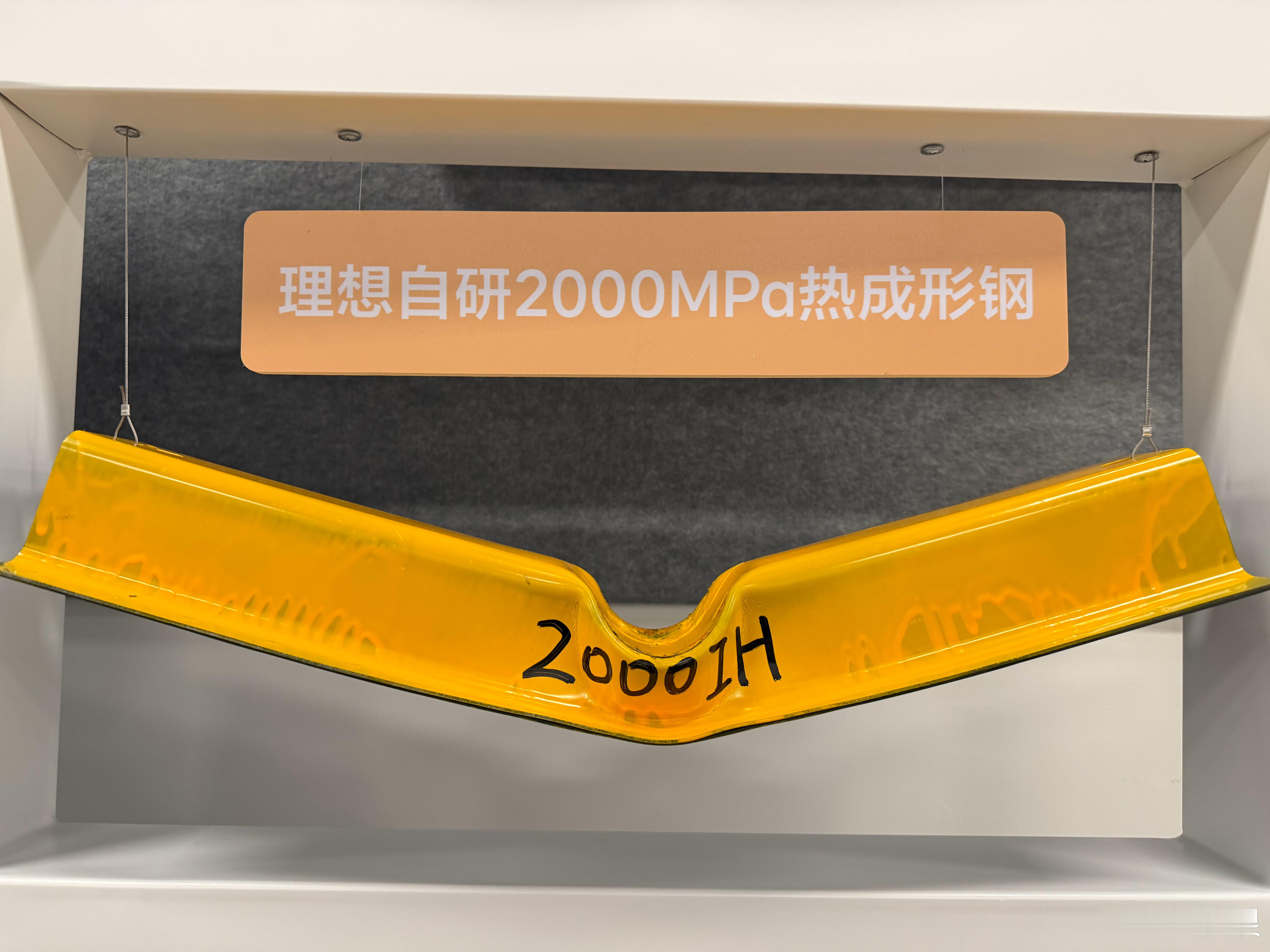 杂牌车材料研发成果,非常直观。红黄绿三块材料形状厚度完全一样,遭受了完全一样的冲击。控制了变量。绿色是1500MPa的热成形钢,可以看到它变形更厉害,但没裂开。没裂意味着它都变形成这个样了,还是能提供足够的强度。“韧性”较好。黄色是理想自研的2000MPa热成形钢,给它起名叫“2000I H”,很明显变形小,而且不裂。一样,强度可能有所下降但下降不多。“韧性”较好。红色是传统2000MPa热成形钢,屈服强度数据和黄的一样。但是可以看到它裂了。裂了意味着相较于明显裂开之前强度断崖式下降。“韧性”一般。强度一样表现也会有区别,就好像两个人身高体重一样,但体脂率肌肉量包括运动表现可能有区别。在钢材上,虽说都是2000MPa的,但实际表现区别较大。比如说撞车的时候,在某一临界的速度之前,韧性好一点差一点区别不大。但一旦到达该速度,韧性差的那个裂开了,断了,就无法提供保护了。我说得有问题不,专业领域有点犯怵帮挑挑毛病。理想材料研发成果大盘点