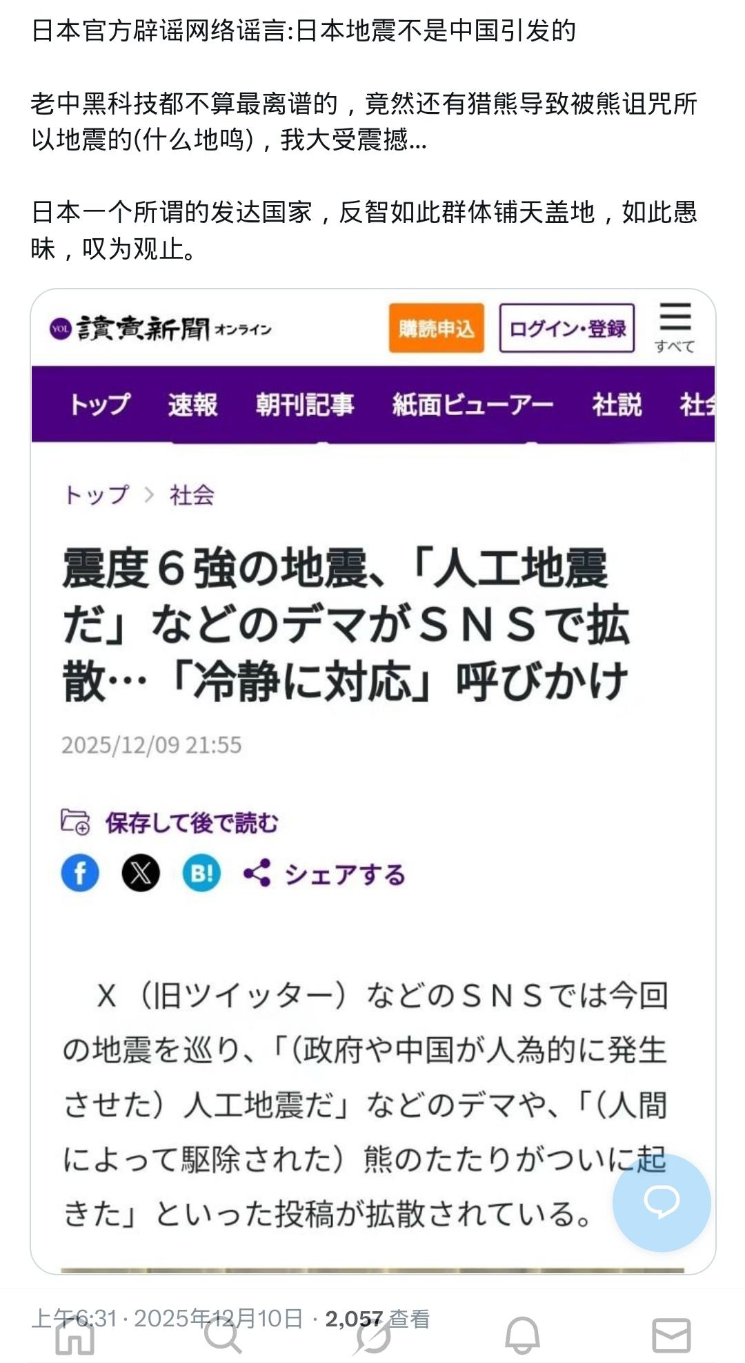 能让《读卖新闻》出来辟谣也当真的活久见了!毕竟它本身就是谣言制造的大本营,可见车力巨人们已经反智到啥程度了! 关于这种黑技术,之前某岛绿霉也曾在政论节目地S命渲染说,台风和沙尘暴都是我们发射的气象武器。 好像依西方这一套制度炮制出来的地方,都无一例外的,让叹为观止啊 Source: X