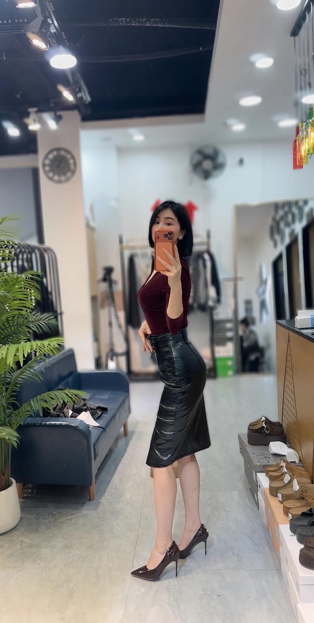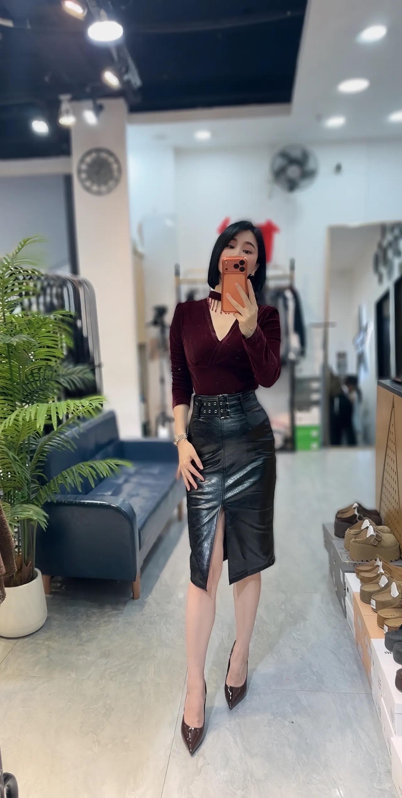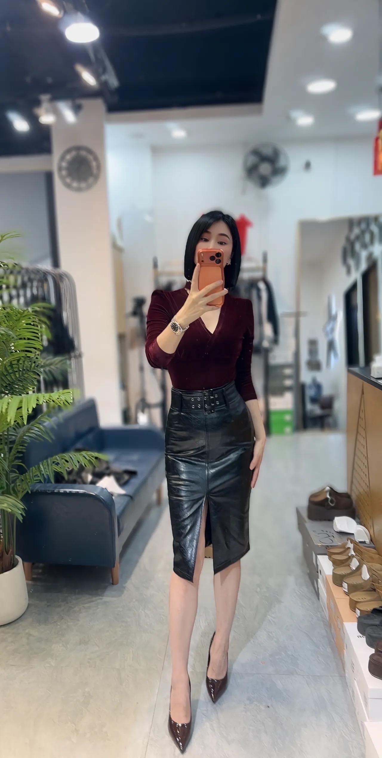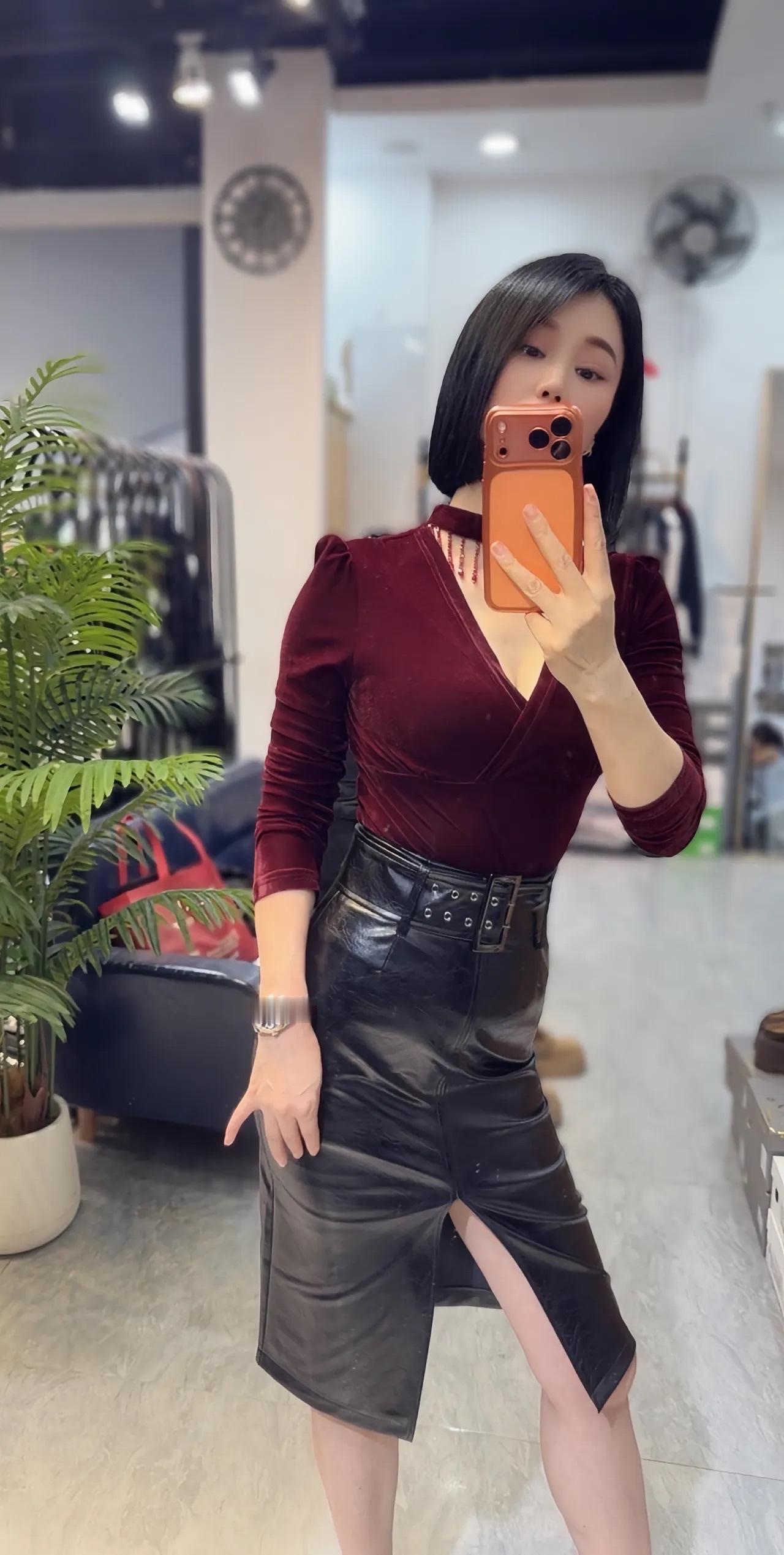 优雅穿搭指南:酒红色上衣+黑色皮裙,尽显时尚魅力!
