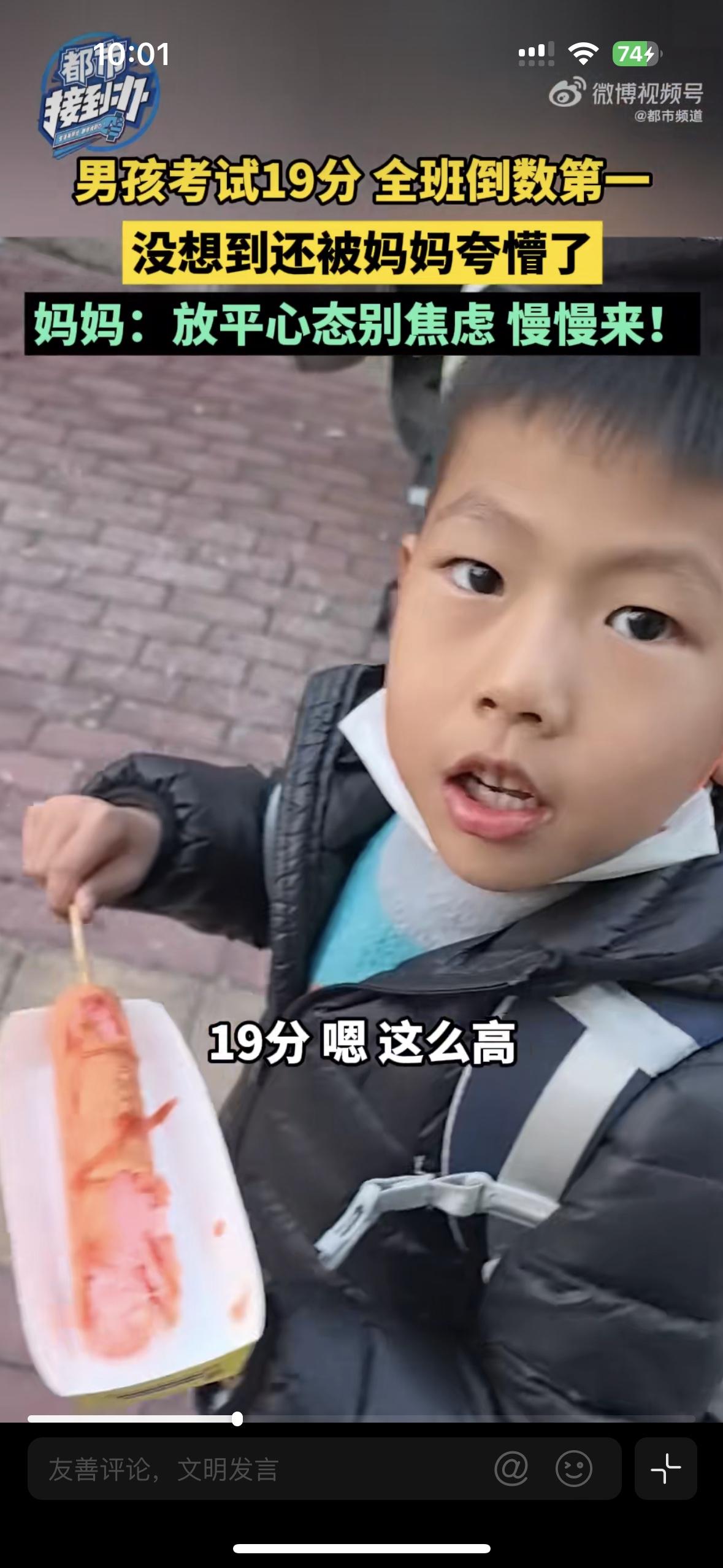 我建议所有妈妈都向这位妈妈学习,孩子一定会越来越优秀 儿子考了19分,妈妈问他考了多少他支支吾吾说了半天才说考了19分,是全班倒数第一名 可妈妈却没有批评他,反而是夸他考的很多了,给了他足够的情绪价值,夸他还有很多提升的空间。一次的成绩并不能代表什么,但长期的批评一定会导致孩子自卑,我们一定要向这位妈妈一样,多鼓励孩子,即使一次考不好,他也会继续努力,说不定下次会更好