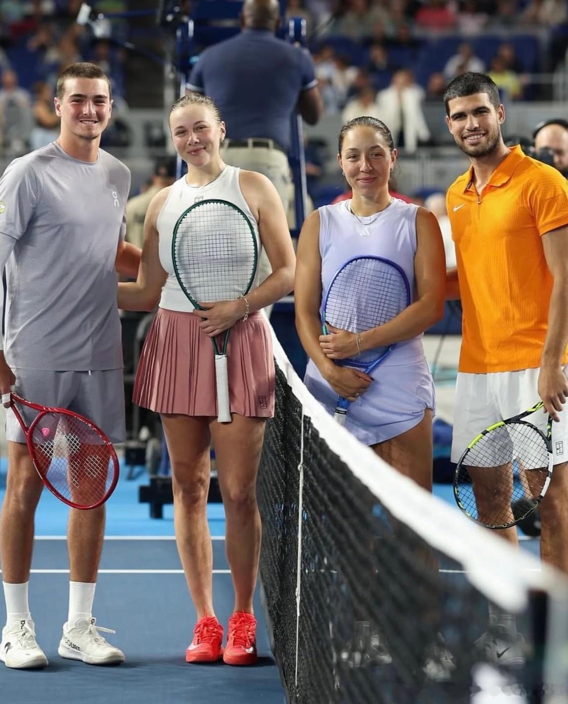 阿尼西莫娃感谢昨晚的迈阿密表演赛,分享了一些照片!“谢谢迈阿密🤍我爱我的城市,能和阿尔卡拉斯、佩古拉、丰塞卡这些宝藏球员们一起,在棒球场比赛,是我的荣幸!”wta
