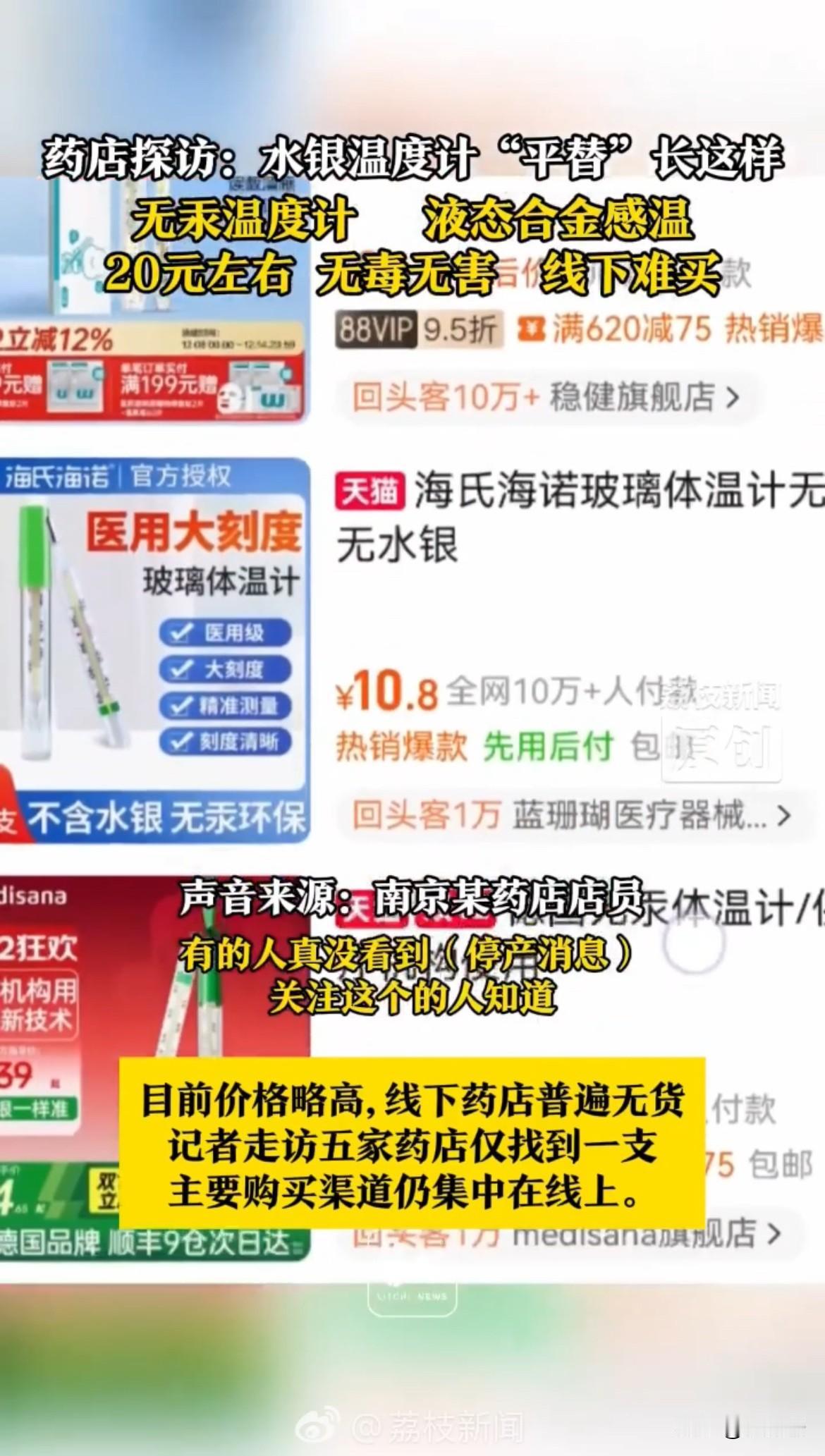 家里常备的水银温度计,以后可就买不到新的了,因为国家已经明确要禁止生产含汞的体温计和血压计了。可能有人会担心,没了水银温度计,以后测体温该用啥?其实不用急,早就有现成的无汞体温计上市了,专门用来替代水银款。 这种新型体温计最厉害的地方,就是把里面有毒的水银换成了镓铟液态合金,听起来挺高级,其实用着跟老款没啥区别。它还是靠液态金属热胀冷缩的原理测温,精度跟水银温度计一样准,能精确到小数点后一位,完全能满足家庭日常使用需求。而且最让人放心的是,它无毒无害,就算不小心摔碎了,里面的合金接触空气后会迅速固化,不会像水银那样挥发成有毒气体,处理起来也简单,直接当普通玻璃垃圾扔了就行,再也不用怕汞污染伤害身体、破坏环境了。 不过现在想买这款无汞体温计,还得费点心思。它的线下零售价大概在20元左右,比起几块钱一支的水银温度计,确实贵了不少。更让人头疼的是,线下药店大多没货,有记者跑了五家药店,最后只找到一支。药店工作人员也说,现在想买无汞体温计,主要还得靠线上渠道,电商平台上随便一搜就能找到,不少品牌的月销量都能突破十万支。 之所以会出现线下缺货、价格偏高的情况,主要是因为水银温度计的存量还特别大,很多家庭还在继续使用,厂家也还在消化现有产能,转型生产无汞产品的速度没那么快。再加上无汞体温计的原材料成本比水银高不少,生产工艺也更复杂,良品率相对较低,这些都推高了它的售价。而且线下药店考虑到库存压力和消费者的接受度,铺货也比较谨慎,自然就很难买到了。 除了无汞体温计,市面上还有额温枪、耳温枪这类电子测温工具,但很多人反馈电子款的精度不够稳定,受环境温度、使用方法影响挺大,有时候测出来的数值不准。相比之下,无汞体温计既保留了传统玻璃体温计的精准度,又解决了水银的安全隐患,使用方法也不用重新学,还是熟悉的“甩一甩”操作,所以慢慢成了很多家庭的首选。 虽然现在无汞体温计还存在价格稍高、线下难买的问题,但随着厂家逐步完成生产线转型,产量提上来之后,价格大概率会慢慢降下来,线下药店的铺货也会越来越全。毕竟淘汰水银温度计是为了环保和大家的健康,这种无毒又精准的平替产品,以后肯定会越来越普及,慢慢取代陪伴了几代人的水银温度计,成为家庭药箱里的新成员。 来源:荔枝新闻