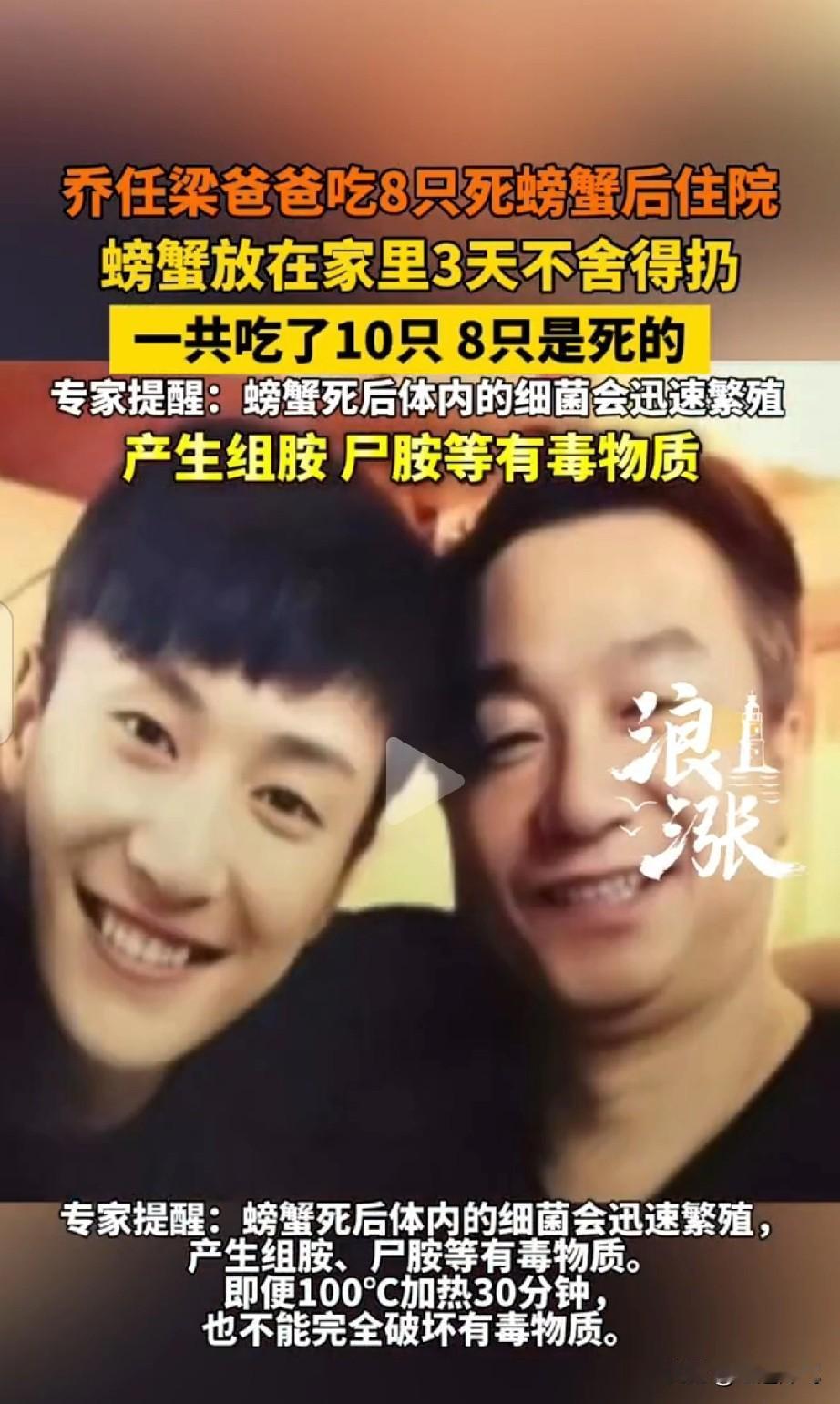 我猜 乔任梁的爸爸想儿子了 人到中年躺在病床上,可是儿子再也不能来看他了。 虽然勤俭节约是美德,但是也不能拿健康来开玩笑呀! 我感觉乔爸爸是有一点喜欢吃螃蟹,所以放了三天还不舍得丢掉。如果这个食物不是他特别喜欢的他可能也就倒掉了。 按他这个身份。不应该不知道死蟹不能吃呀。 经过这个事儿,乔爸爸躺在病床一定特别想自己的儿子,谁不想人到中年躺床上的时候,儿孙在床前呢?