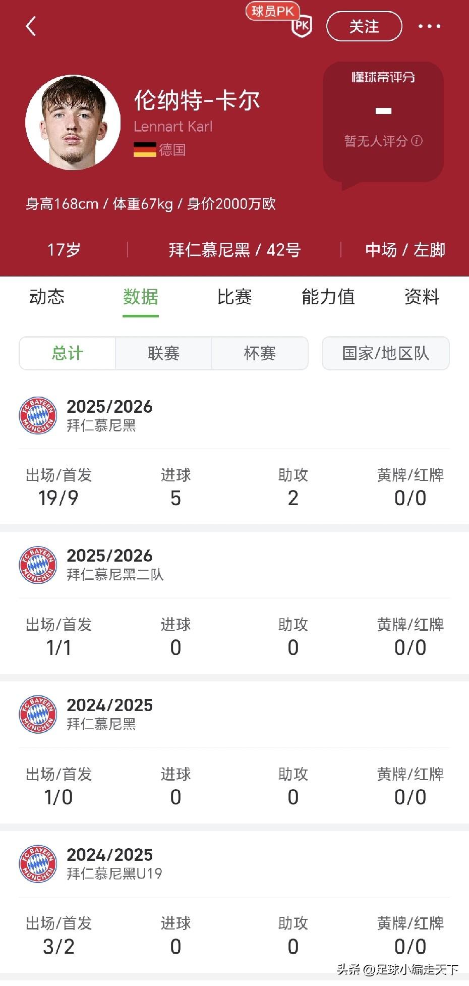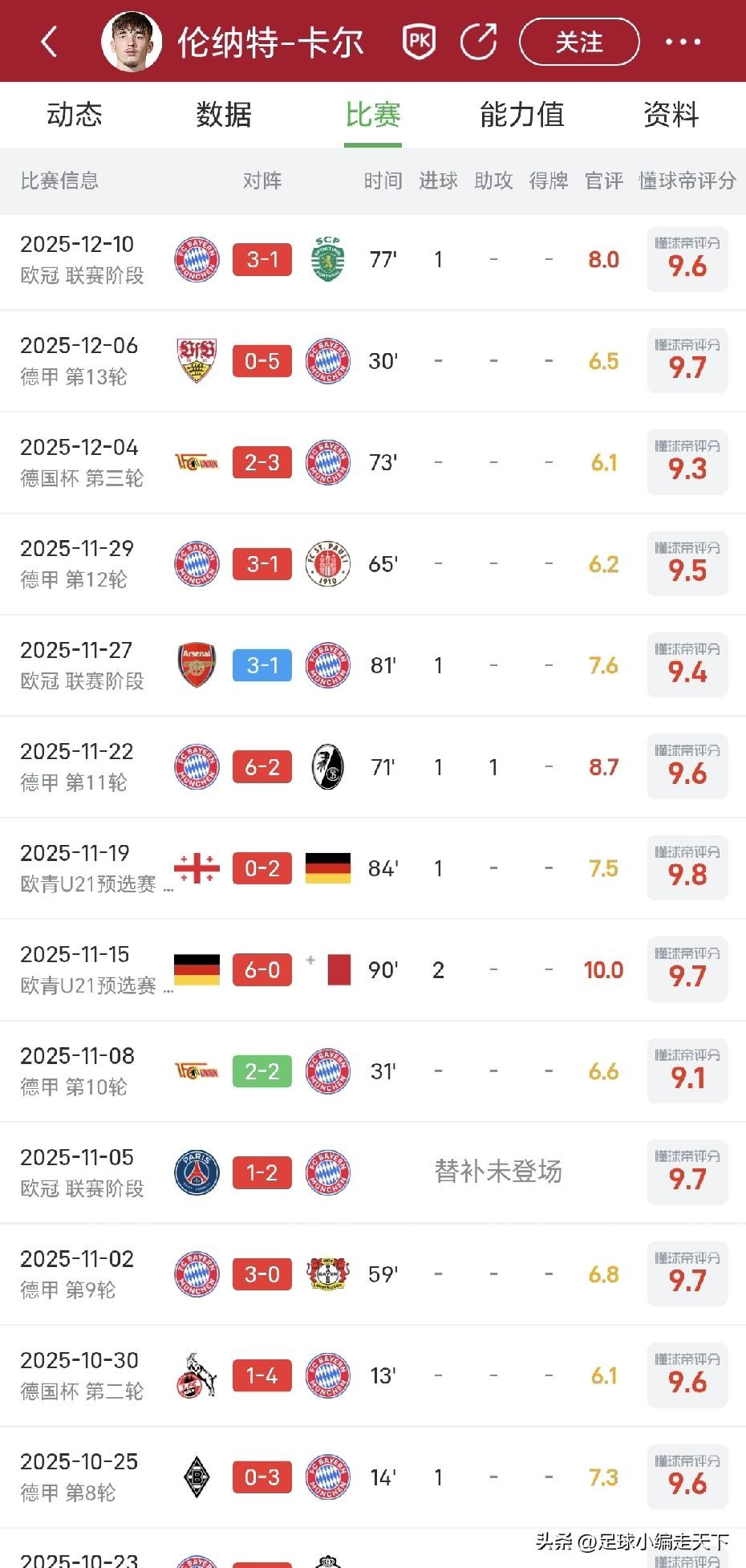 拜仁这个17岁的卡尔真是前途无量啊!梅西的身材,里贝里的对抗,元首的长相。真怕他进球后来一句:sieg heil[我想静静]。 今天这场卡尔差点梅开二度!第一个判罚越位球那纯属体毛越位。第二个进球非常精彩!欧冠四场三球,对于17岁还是在豪门球队里,这数据真的可以!格纳布里也是状态越来越好,一个进球一个助攻,应该是本场最佳球员吧。马上冬歇期了,保持健康,健康我仁有机会再度夺得欧冠!为三冠王我们继续前进! 话说拜仁现在真的是源源不断出现小妖接班人啊,从穆勒到穆西亚拉再到现在的卡尔。一个比一个牛![赞]