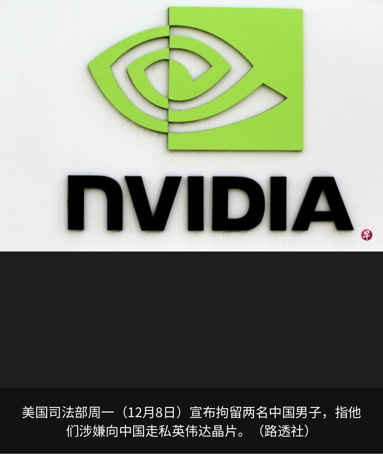美指控两男子走私英伟达晶片 美国司法部12月8日表示,检方指控居住在纽约的中国