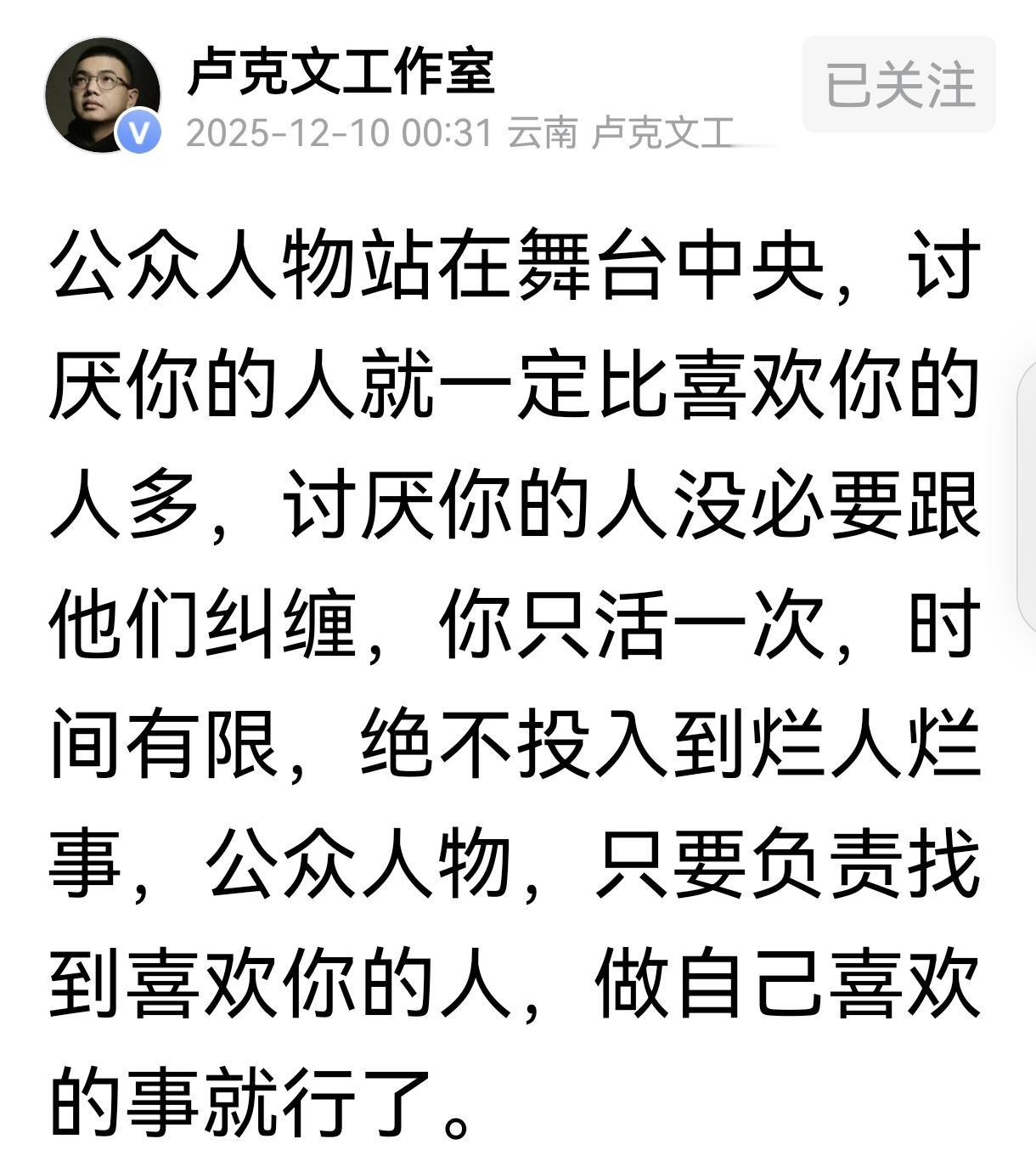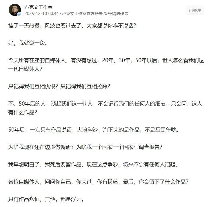 卢克文回应了,云淡风轻 就两点: 多少年后留下的是作品,而不是争议, 公众人物站在舞台中央,任人评说。 回应依然如他过往所说,踏实做自媒体,让作品说活,不靠争吵带节奏引流,这正是他成功的本色。 没见过他的帖文和任何一个人斗嘴,尽管黑他的人许多,脚踏实地拼画万里江山图,巡游世界展示国外风情。 他聘有50多人的团队,集思广益输出正能量,有的大V也聘有助理,但专事拉黑举报。 格局,立见高下!