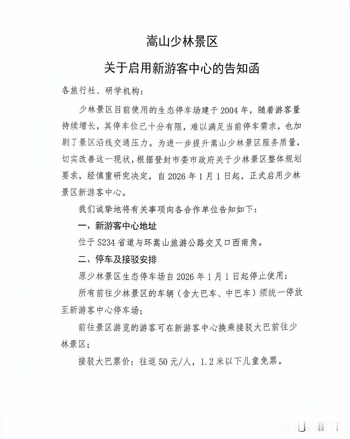 你们还不知道吧?过年再来少林寺游玩需要停新停车场,少林寺门口的停用了!自2026年1月1日起启用!来让你们看下新停车场🅿️周围环境及价格。 新停车场距离少林寺大概5-6公里路程,周边环境也不错,天气好的时候直接欣赏嵩山美景。停车费用7座以下15元/车,中巴20元/车 大巴25元/车。直接接驳车的往返费用太贵50元/人,1.2米以下儿童免费! 好多网友吐槽50元的费用[笑哭],这是想钱想疯了? 拍了照片你们可以看下,毕竟照片比我的介绍更直观。咱也不知道🤷🏻♂️往返10公里的50元价格是怎么来的?现在从登封去郑州单趟八九十公里滴滴巴士才9.9元[抠鼻]。 太随意了,把游客当韭菜了[笑哭],不说了!我去刷下新的群众的吐槽😵💫。少林寺 少林寺旅游