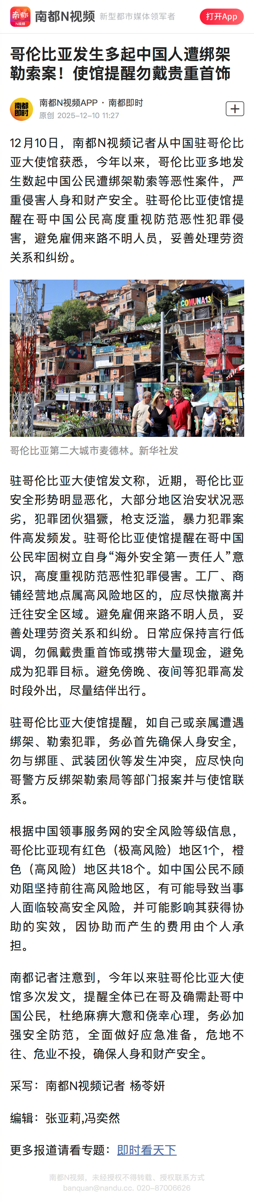 【#哥伦比亚发生多起中国人遭绑架勒索案#!使馆提醒勿戴贵重首饰】#驻哥伦比亚使馆提醒勿戴贵重首饰#12月10日,南都N视频记者从中国驻哥伦比亚大使馆获悉,今年以来,哥伦比亚多地发生数起中国公民遭绑架勒索等恶性案件,严重侵害人身和财产安全。驻哥伦比亚使馆提醒在哥中国公民高度重视防范恶性犯罪侵害,避免雇佣来路不明人员,妥善处理劳资关系和纠纷。驻哥伦比亚大使馆发文称,近期,哥伦比亚安全形势明显恶化,大部分地区治安状况恶劣,犯罪团伙猖獗,枪支泛滥,暴力犯罪案件高发频发。驻哥伦比亚使馆提醒在哥中国公民牢固树立自身“海外安全第一责任人”意识,高度重视防范恶性犯罪侵害。工厂、商铺经营地点属高风险地区的,应尽快撤离并迁往安全区域。避免雇佣来路不明人员,妥善处理劳资关系和纠纷。日常应保持言行低调,勿佩戴贵重首饰或携带大量现金,避免成为犯罪目标。避免傍晚、夜间等犯罪高发时段外出,尽量结伴出行。驻哥伦比亚大使馆提醒,如自己或亲属遭遇绑架、勒索犯罪,务必首先确保人身安全,勿与绑匪、武装团伙等发生冲突,应尽快向哥警方反绑架勒索局等部门报案并与使馆联系。南都N视频记者 杨苓妍