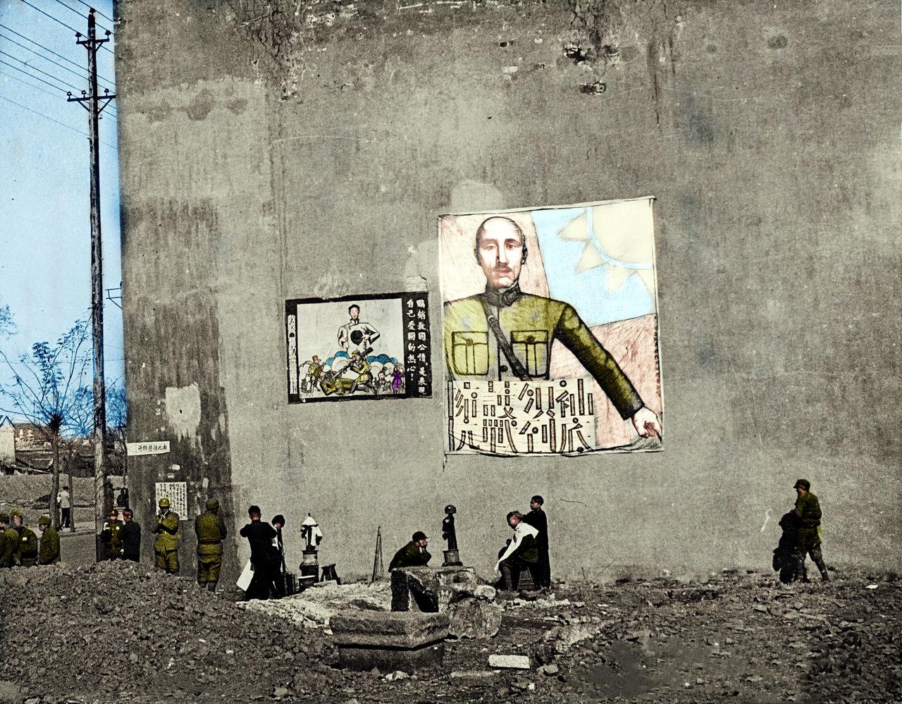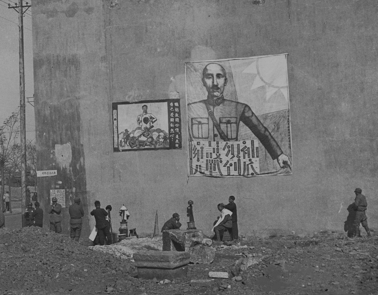 这张被命名为“在常凯申眼皮下剃头”的老照片现存于美国奥伯林学院档案馆。 在街边一处墙壁上,贴着常凯申的巨幅画像,他一身戎装,器宇轩昂,一手指向左下方。人像右侧还有一张尺寸较小的宣传画,描绘的是中国军人英勇杀敌的景象,旁题为:购销救国公债,是表现自己的爱国热心!至于这些卖出的公债是否全部用于抗日了,只有天知道。 更为有意思的是,这本来是一张严肃主题的照片,却因为美国人的注释和一名正在常凯申手指下解决私人问题的士兵完全改变了画风,有了一种莫名其妙的喜感。 从这个小细节中,我们亦能管中窥豹,了解到当年国民党军队纪律之松懈。