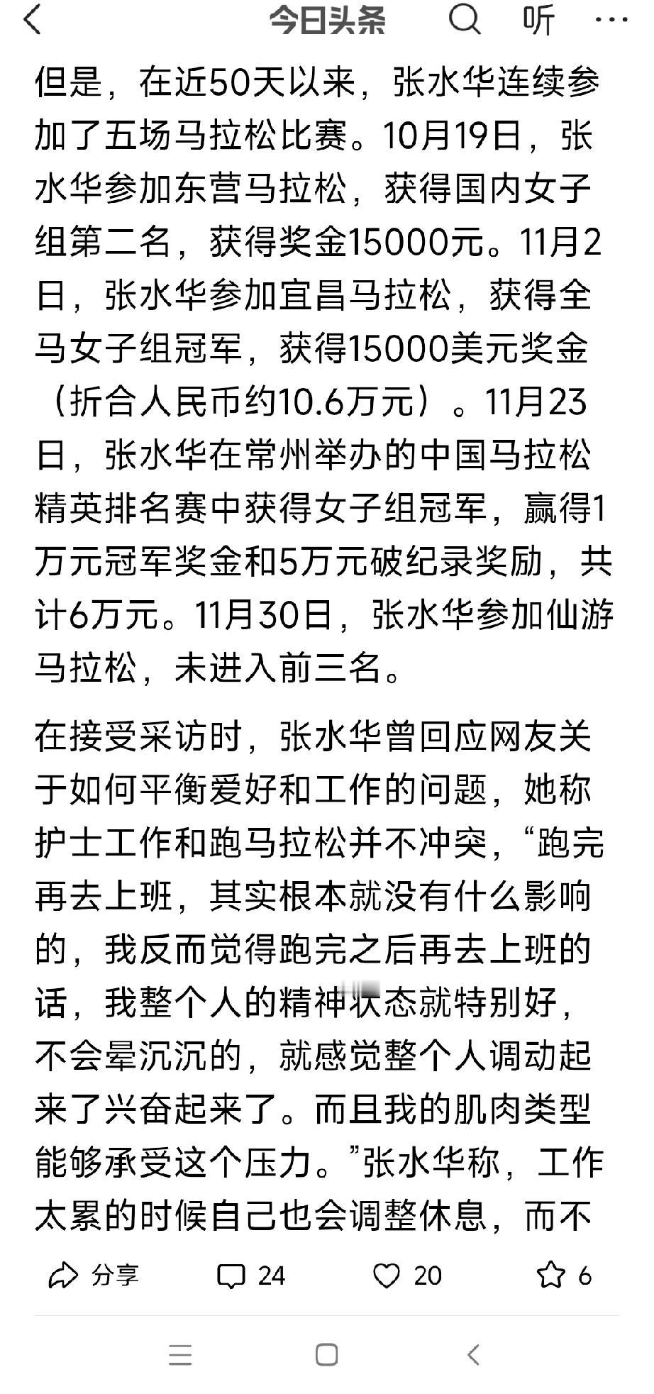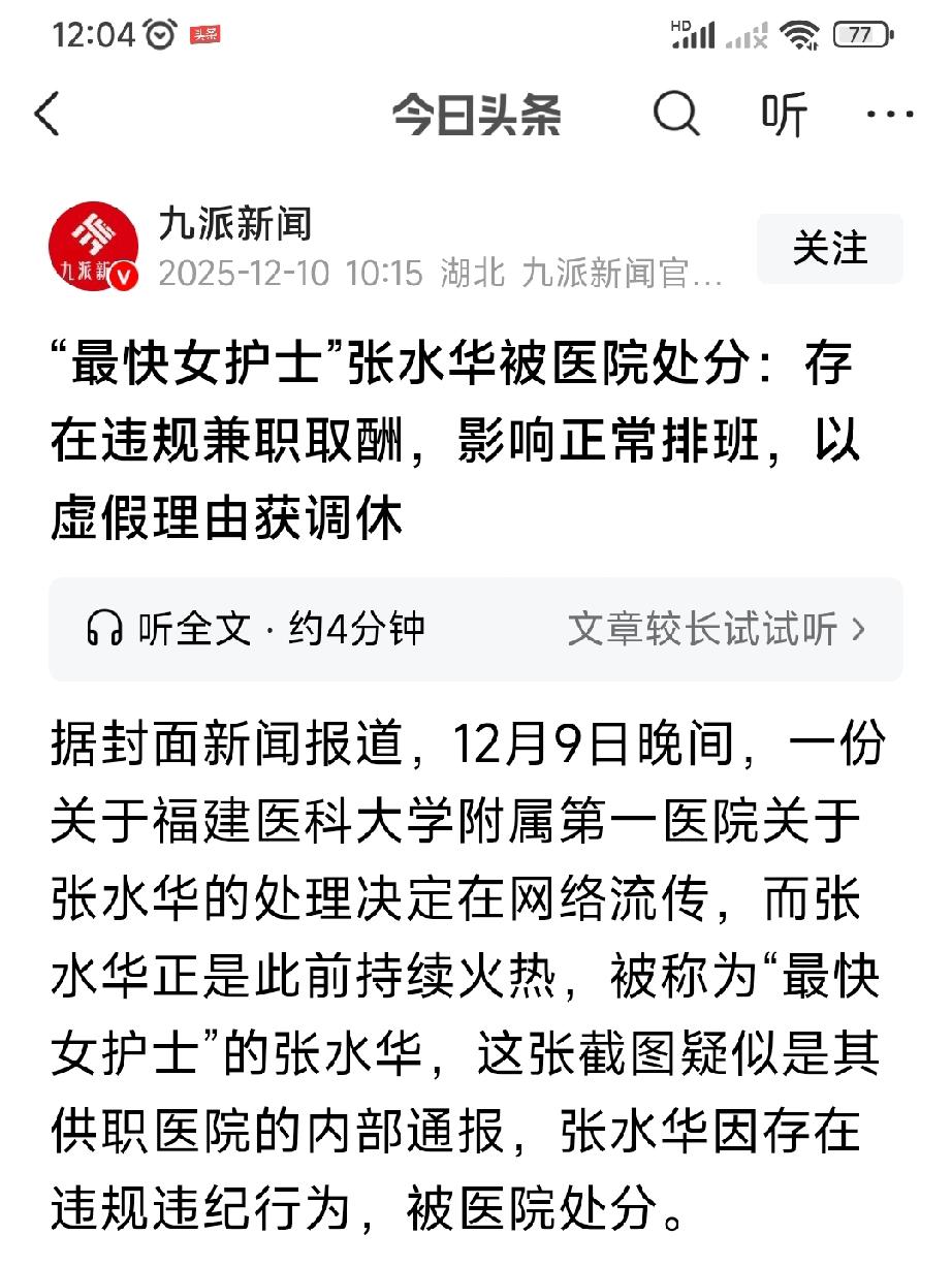 “最快护士”张水华遭医院警告处分,因其违规兼职取酬,影响了正常排班。 张水华曾表示,护士工作与跑马拉松并不冲突,跑完后并无不良影响,反倒感觉上班时精神状态更佳,整个人都被调动起来,兴奋不已。她还称:“我的肌肉能承受这个压力。”
